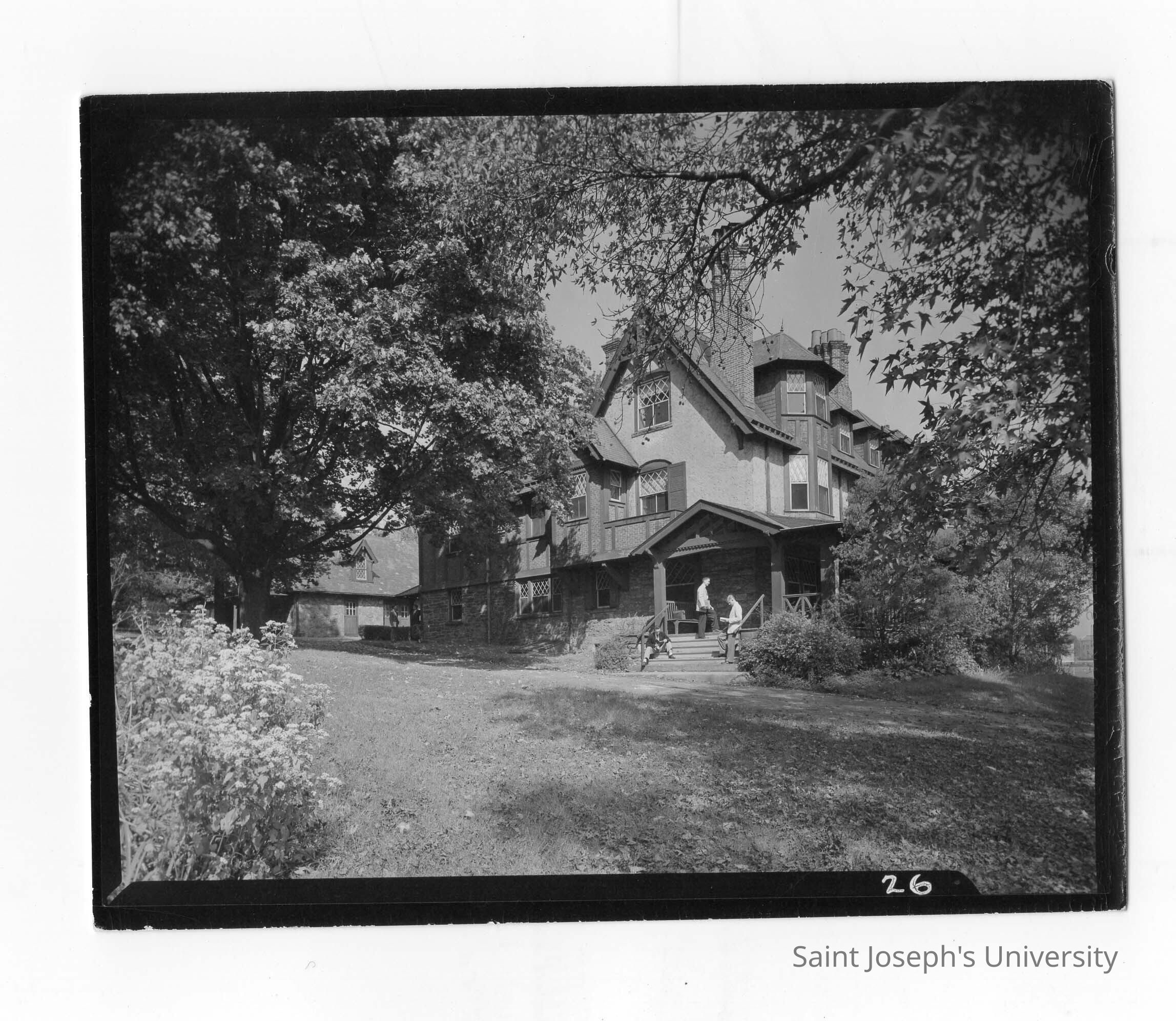 Exterior view of Simpson Hall with two students standing on porch steps.