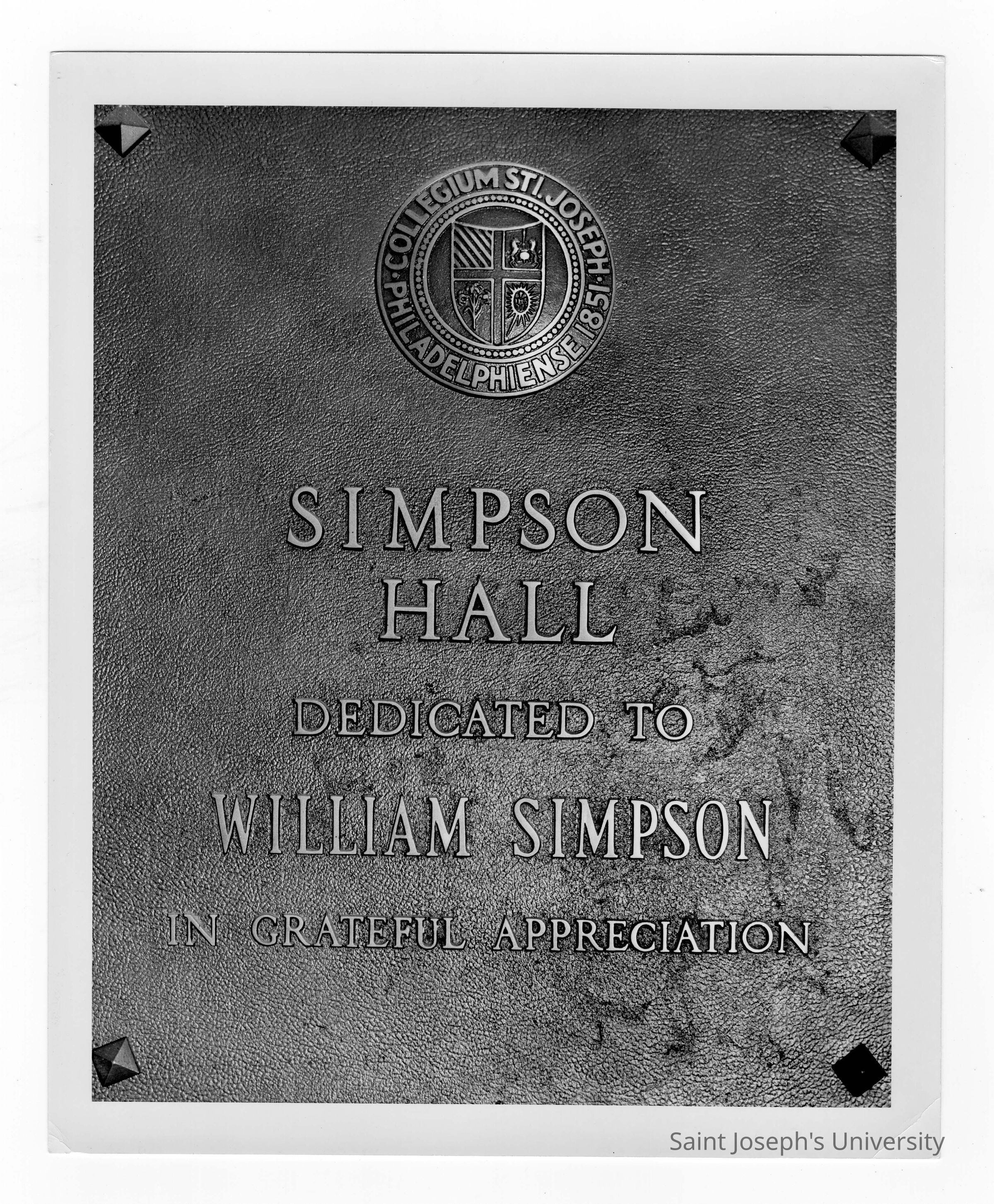 Dedication plaque for Simpson Hall (dedicated to William Simpson).
