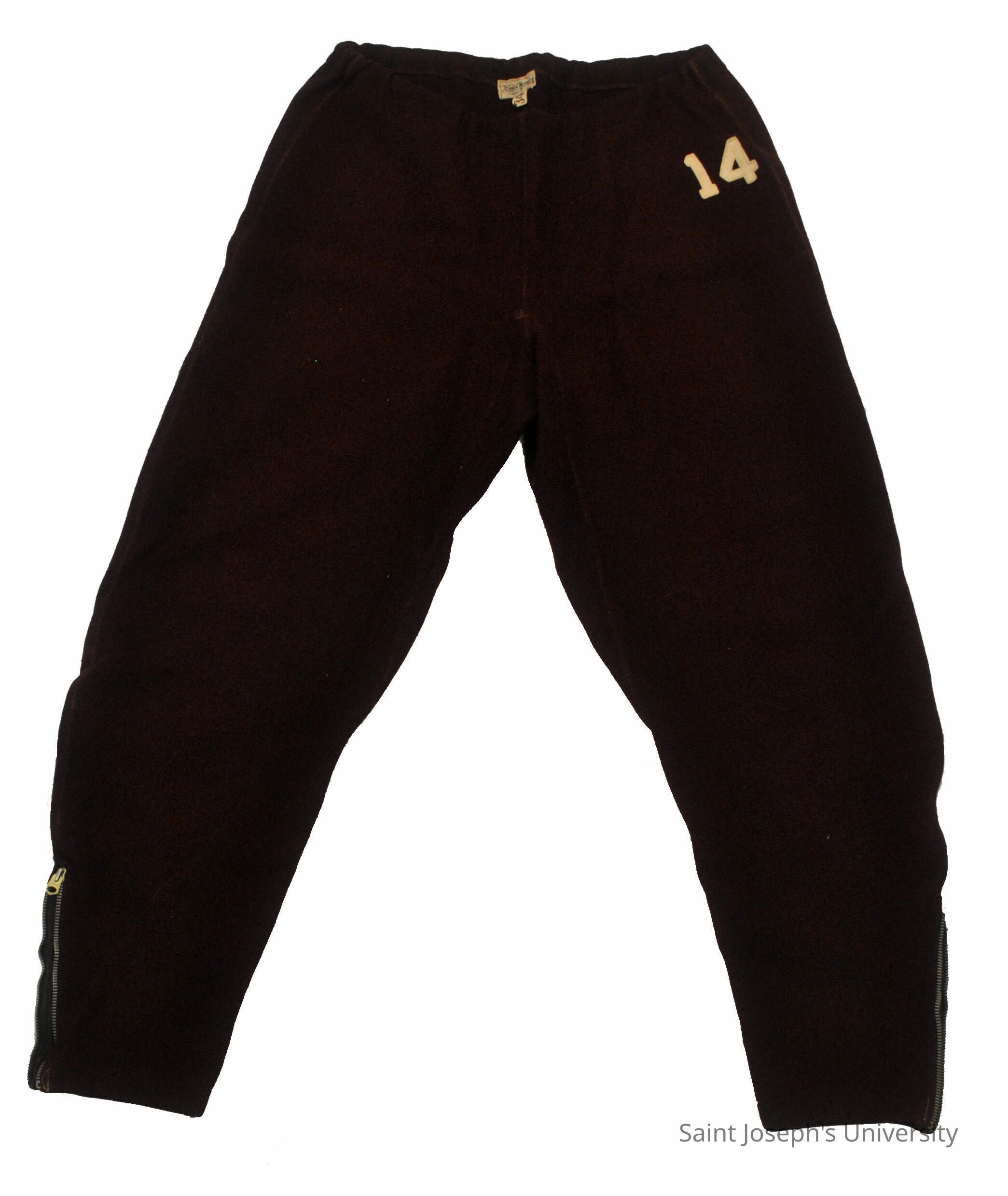 Maroon wool SJC athletic pants with zippers at the ankles and the number "14" on the left hip area. Size 34.
