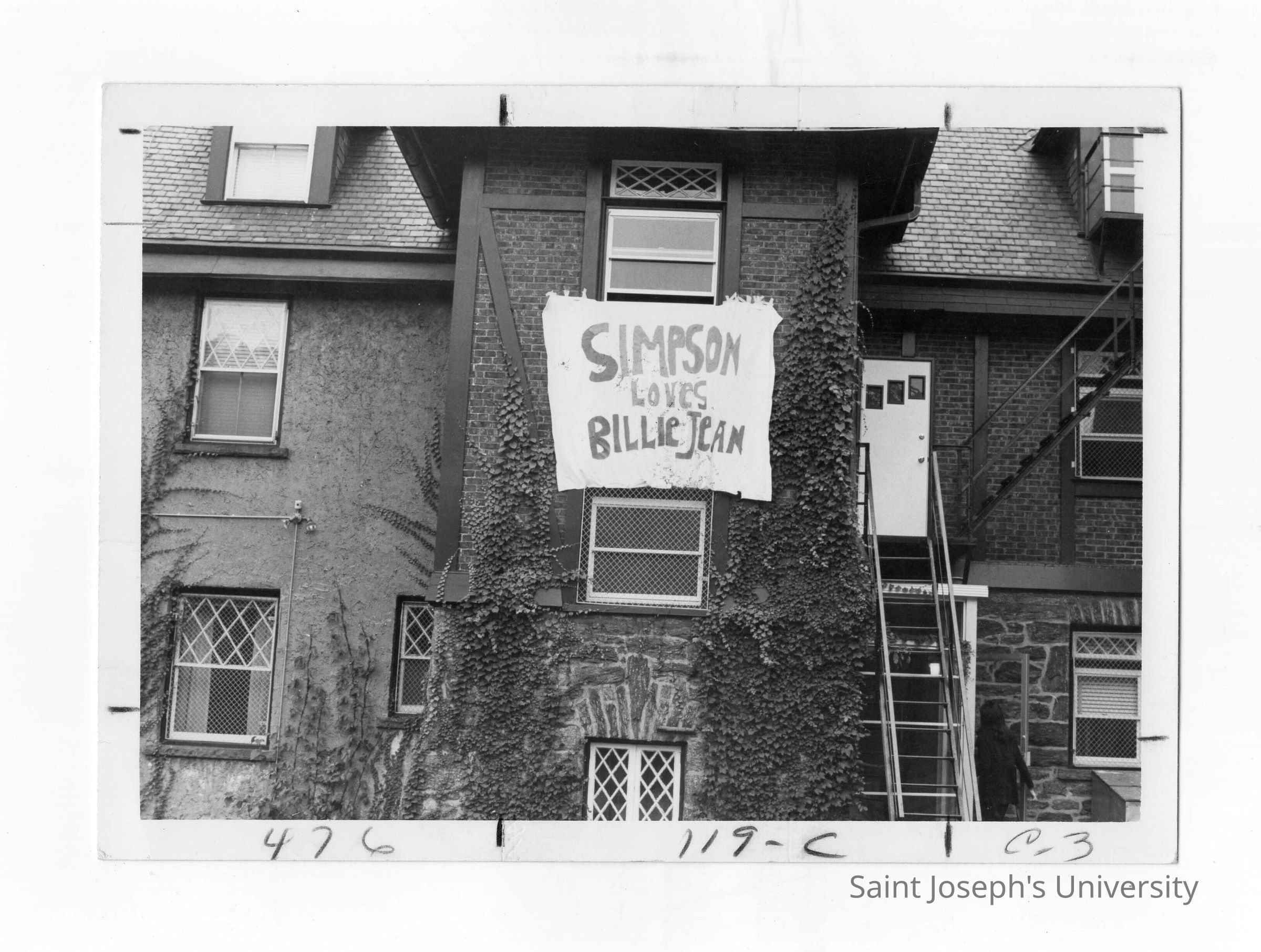 Exterior view of Simpson Hall with sign hanging from window stating, "Simpson loves Billie Jean."