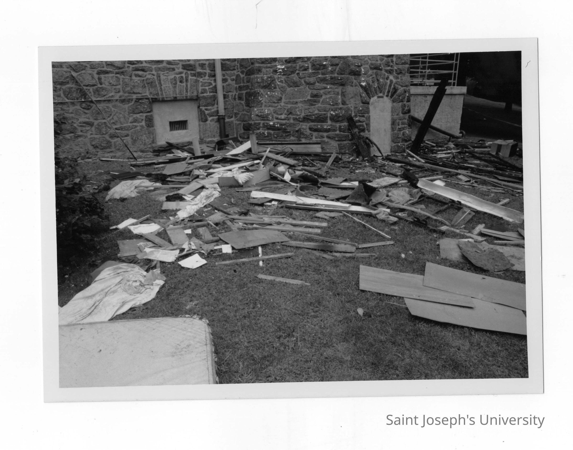 Exterior view of debris on ground outside of Simpson Hall after fire.