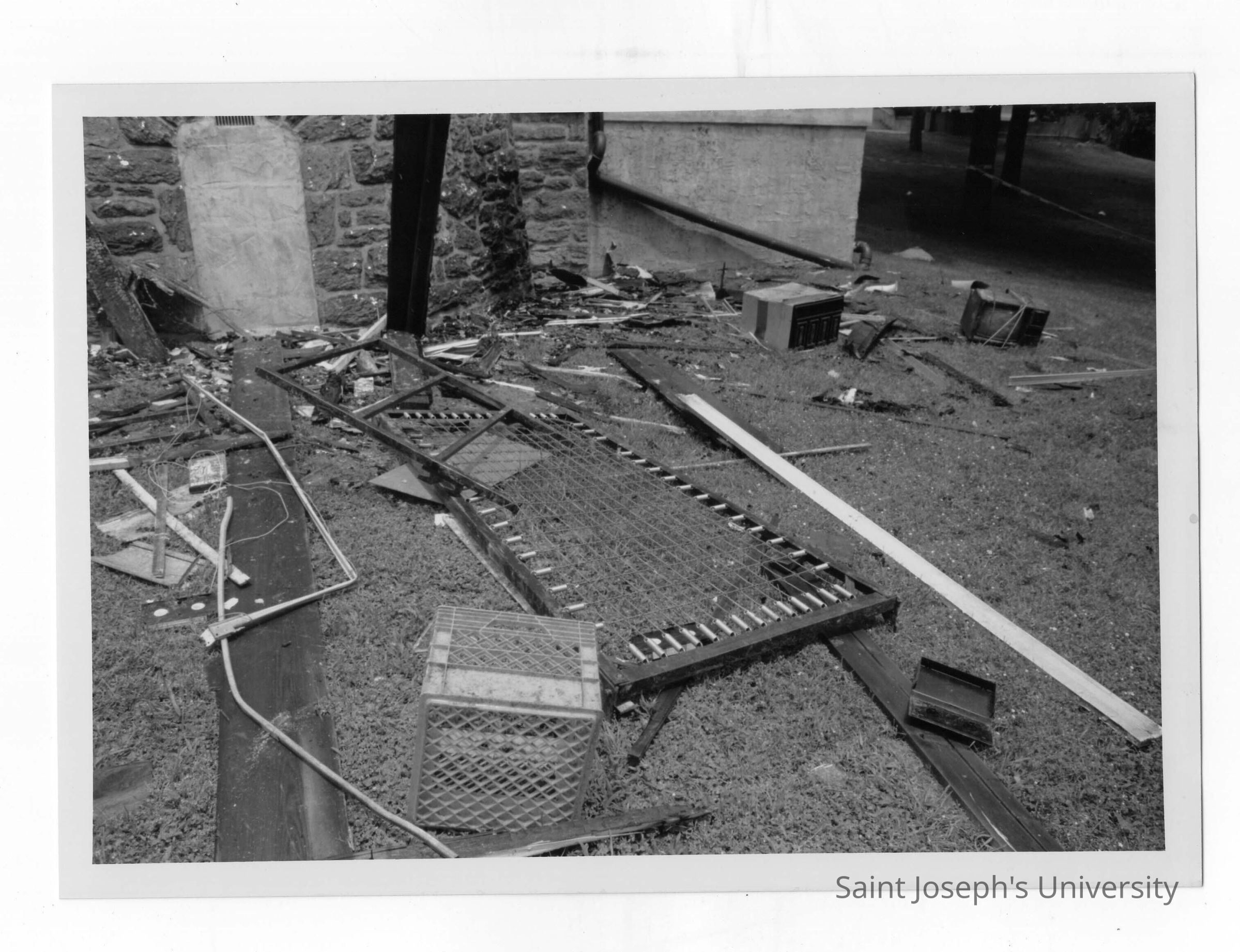 Exterior view of debris on ground outside of Simpson Hall after fire.