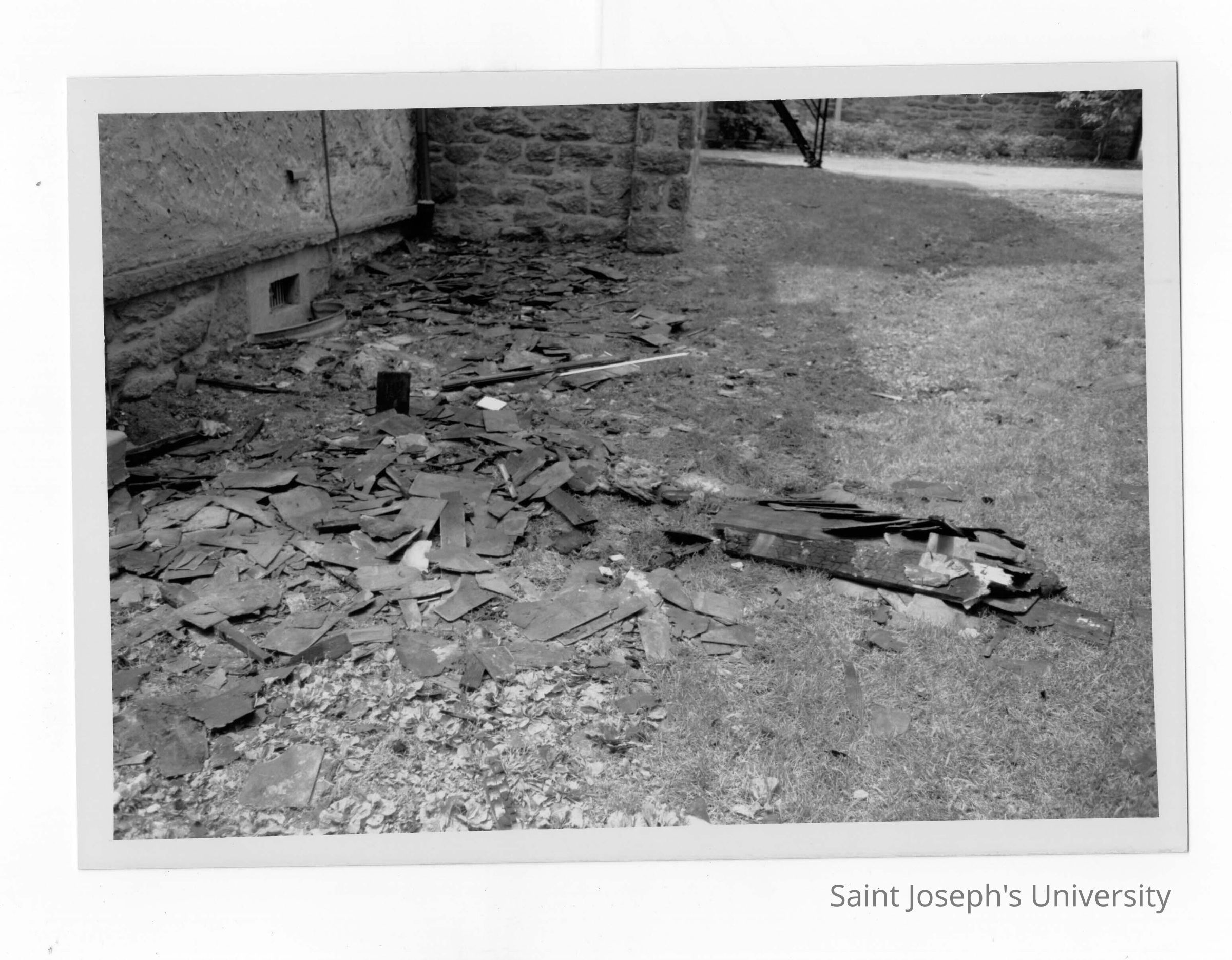 Exterior view of debris on ground outside of Simpson Hall after fire.