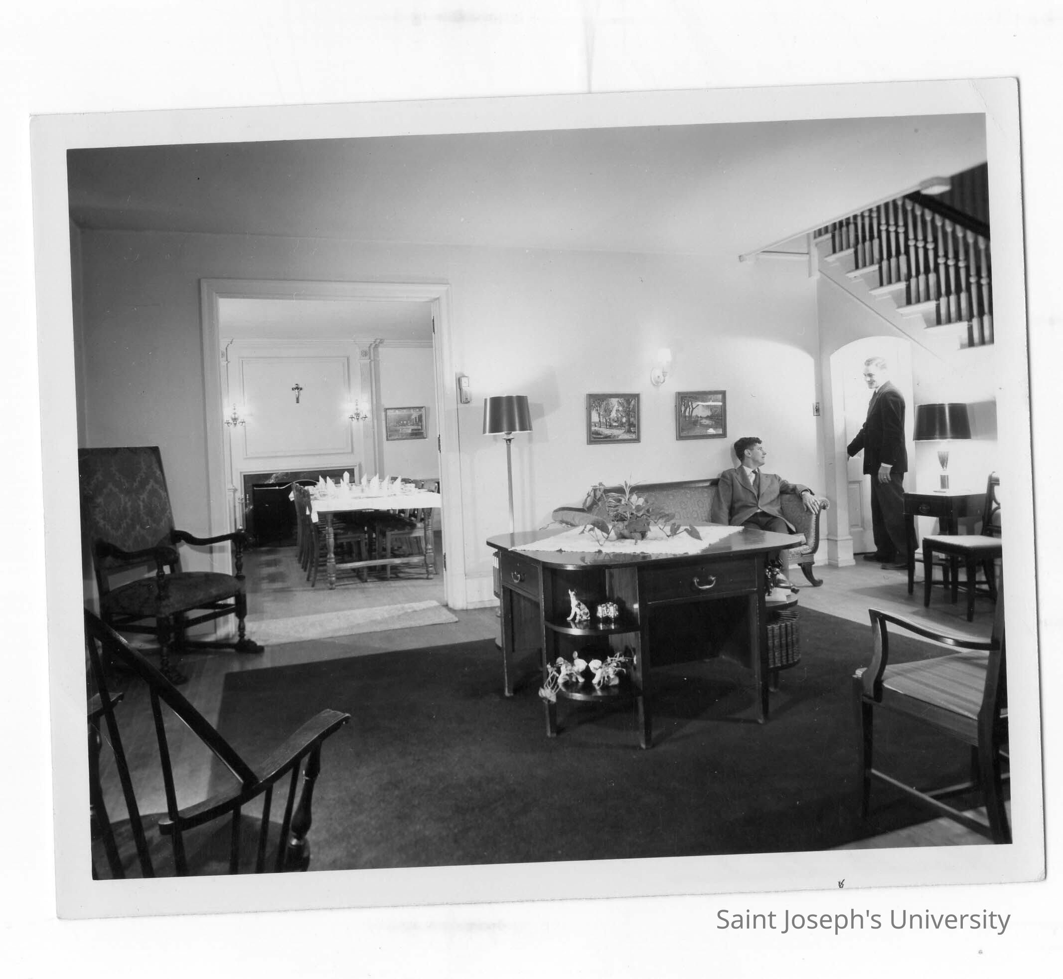 Interior of Simpson Hall with two students in living room taken for 1951 centenary edition of Crimson and Gray.