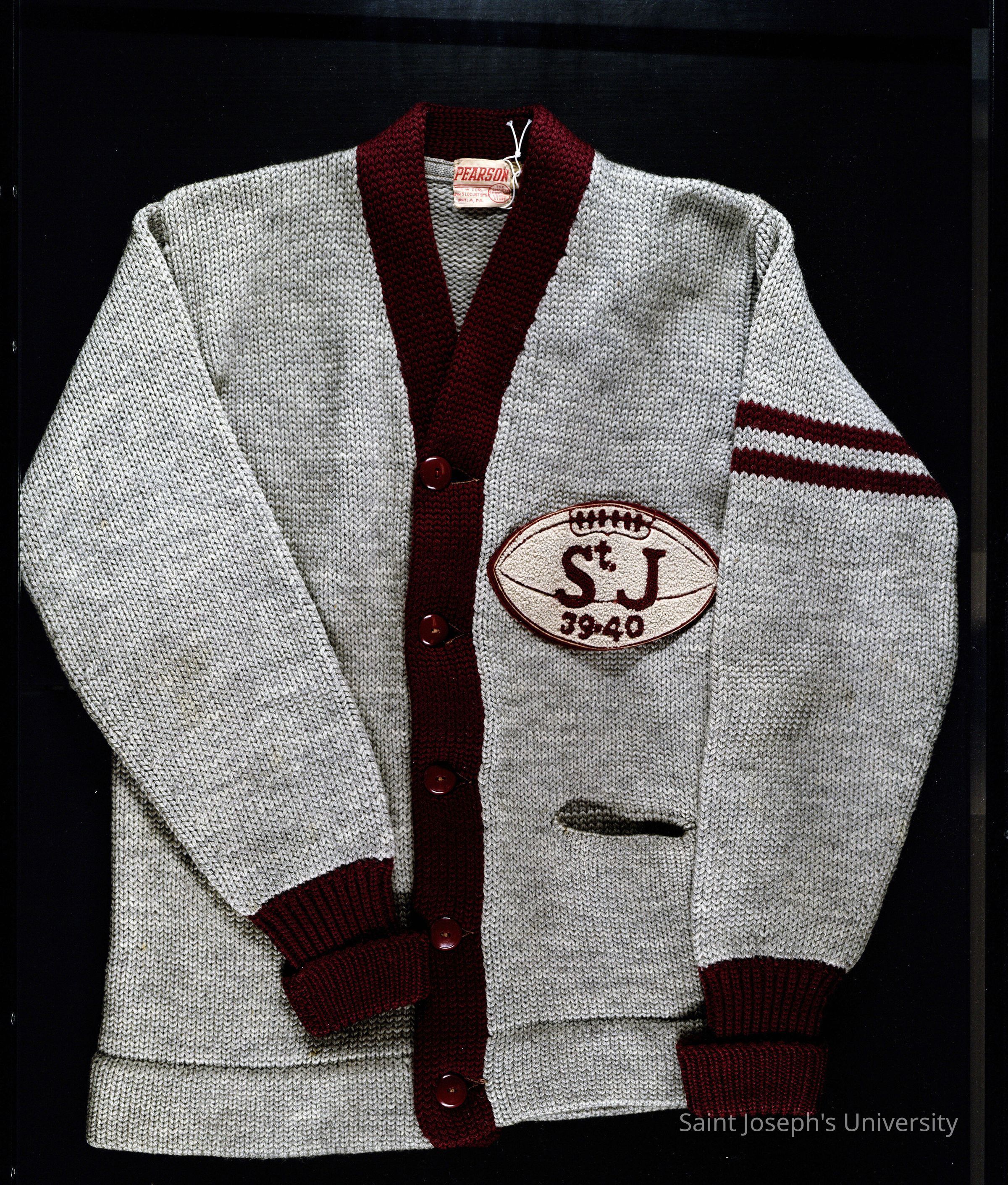 Gray knit cardigan sweater with crimson details, plastic buttons, and . Crimson lines are around the collar and buttons, the sleeve ends and around the football emblem found on the left breast. The football contains "ST. J 39-40." Size 10 or 40.Made/Created