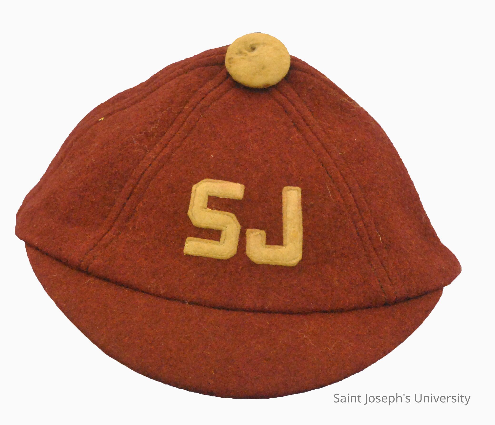 Crimson dink or beanie with gray top button and "SJ" letters. Crimson brim with intact leather liner.