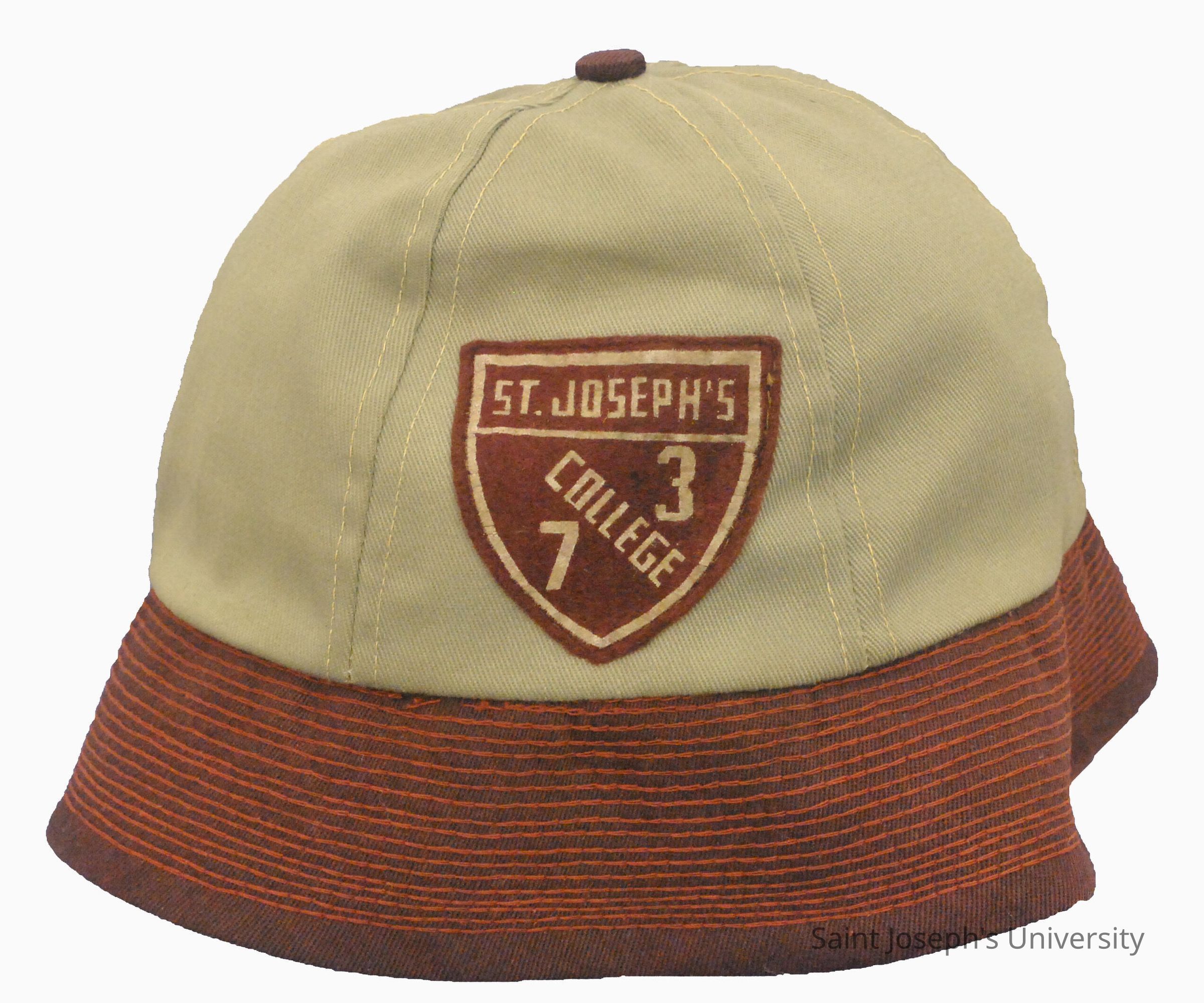 Gray weaved rain hat with surrounding wide crimson brim. Crimson top button and school shield noting "SJC 1973." Leather liner.