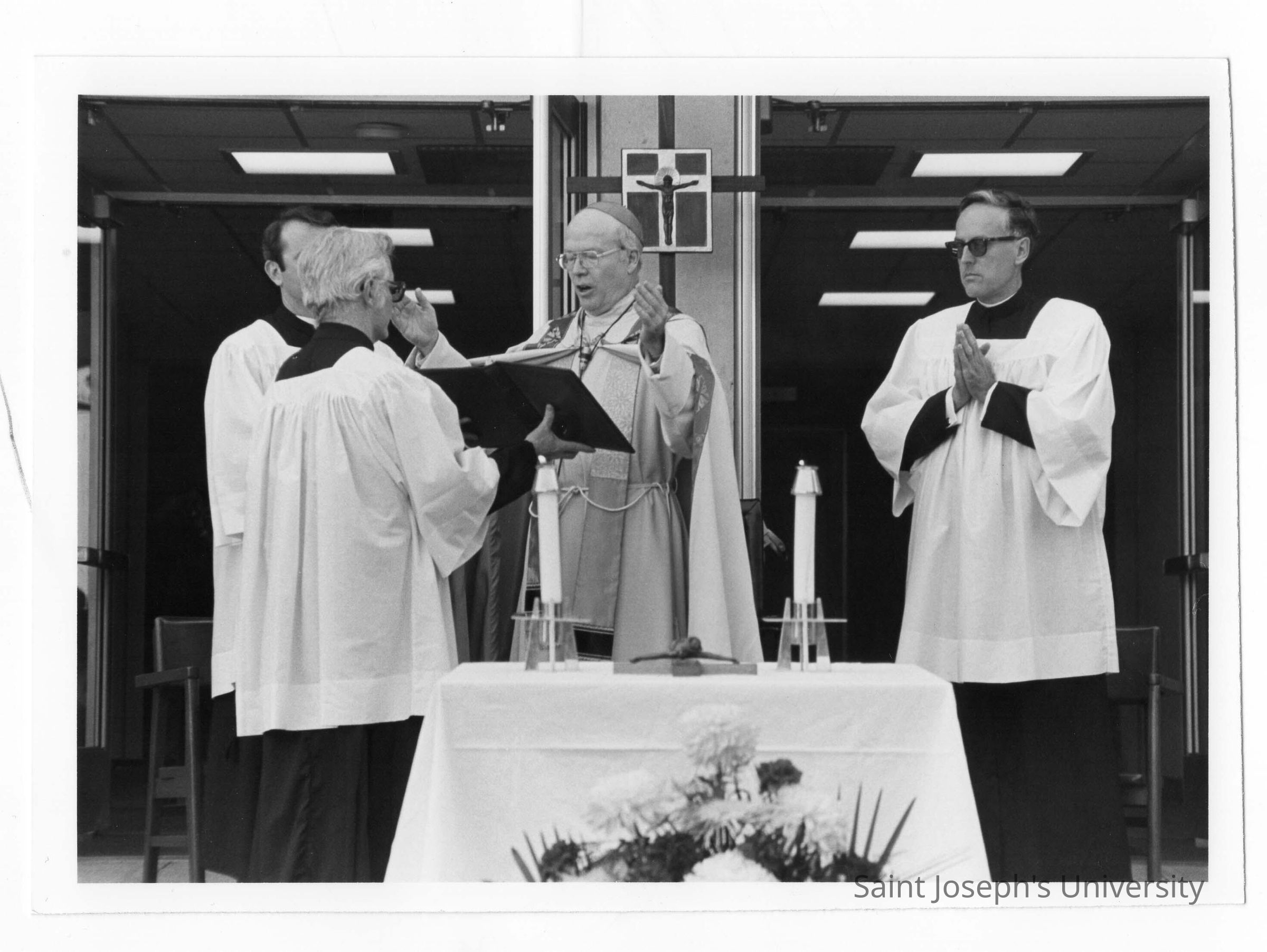 Dedication of Sourin Residence Center with Donald I. MacLean, S.J., Rev. Francis B. Schulte, and others.