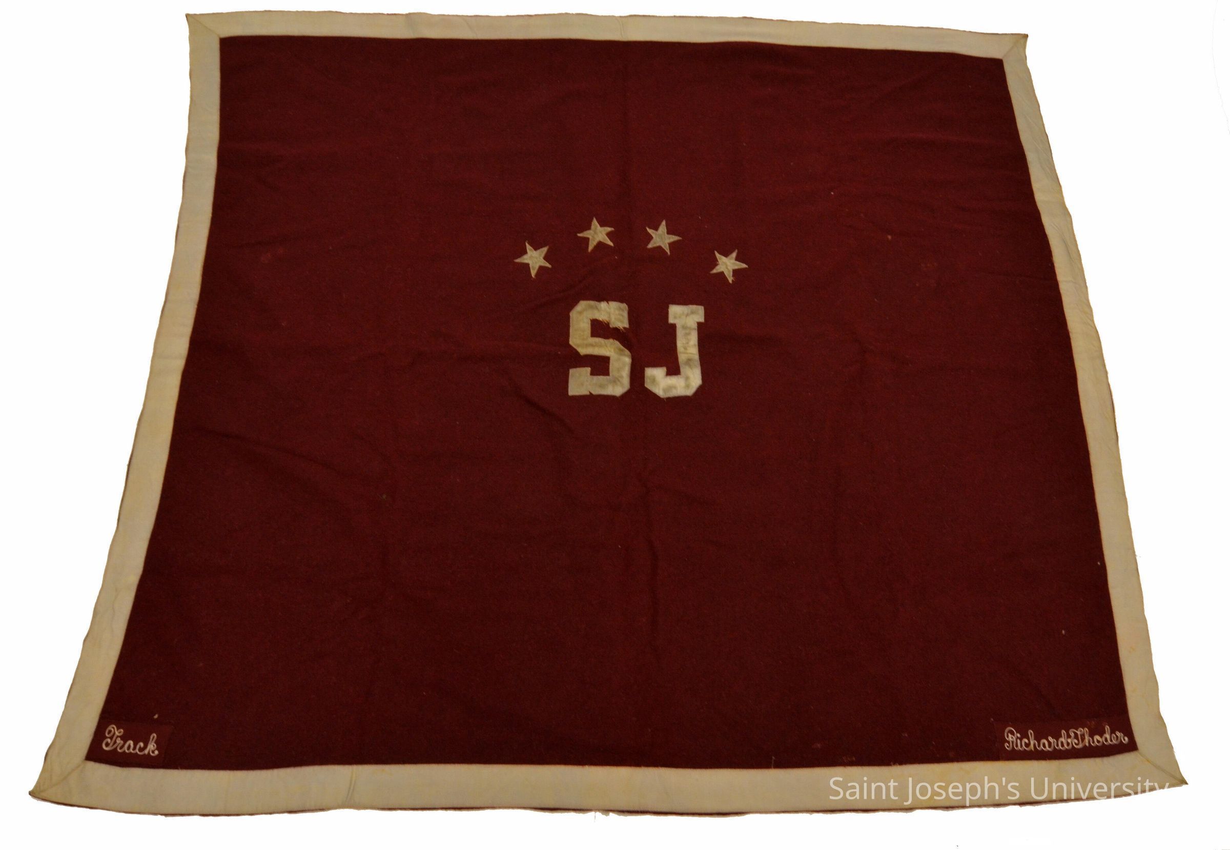 Crimson wool blanket with border of unknown gray fabric. Embroidered on blanket edge, "RICHARD THODON TRACK." The center of the blanket includes stitched "SJ" and outlines of stars. May have been donated around 1998.