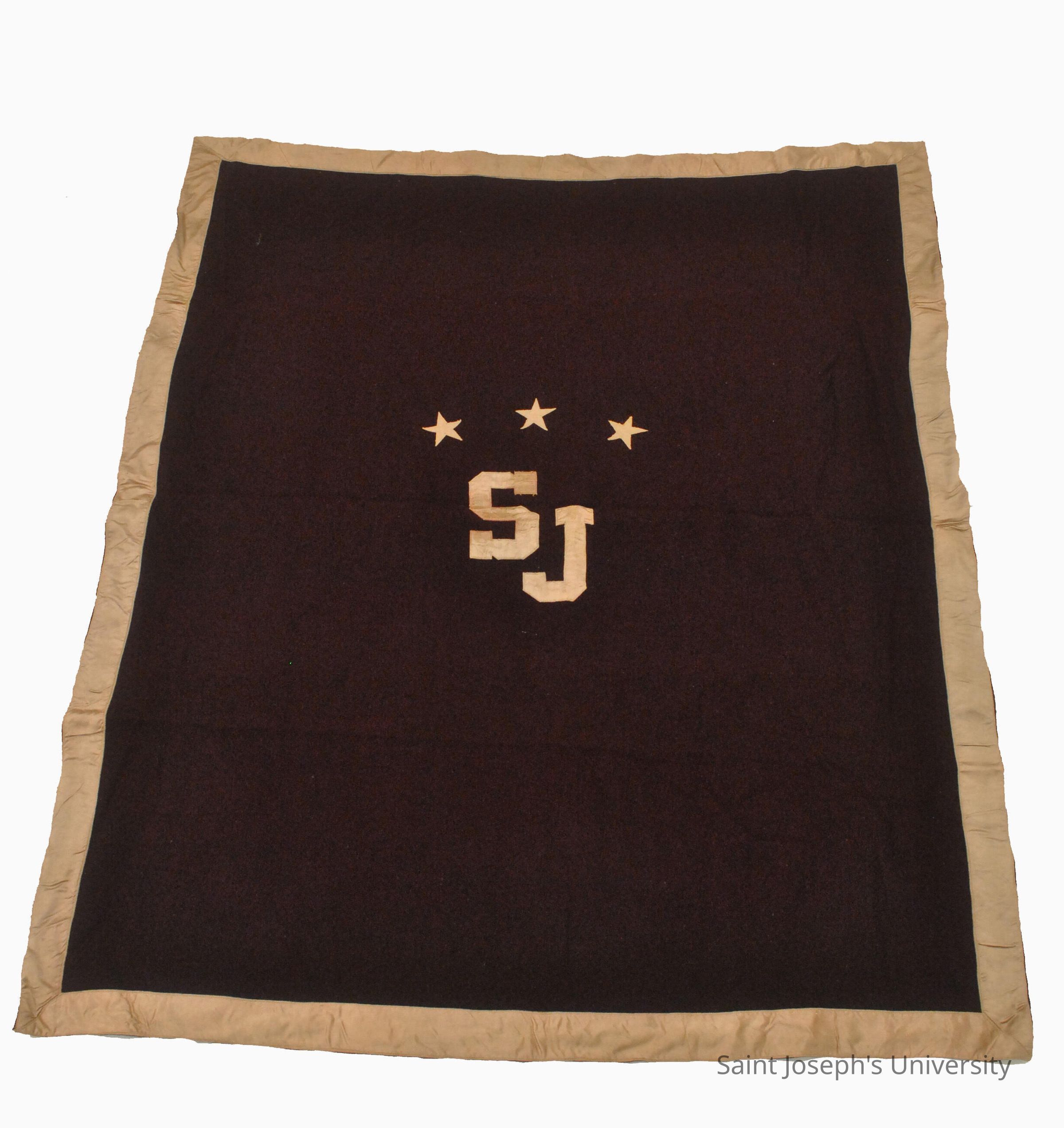 Crimson wool blanket with border of unknown gray fabric. "SJ" and the outline of stars are stitched in the center of the blanket. May have been donated around 1998.
