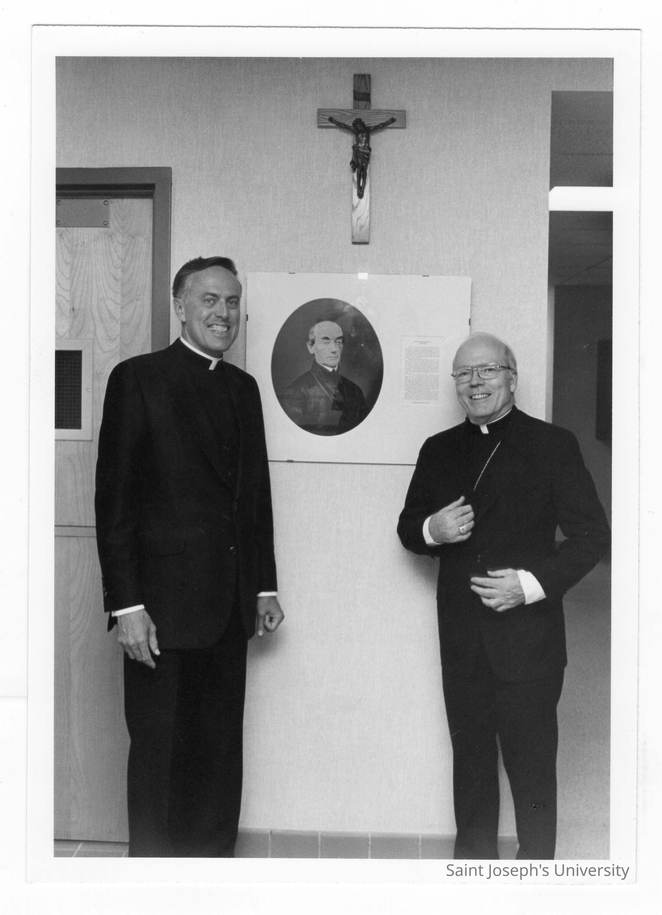 Donald I. MacLean, S.J. standing next to photo of Edward J. Sourin, S.J. at dedication of Sourin Residence Center.