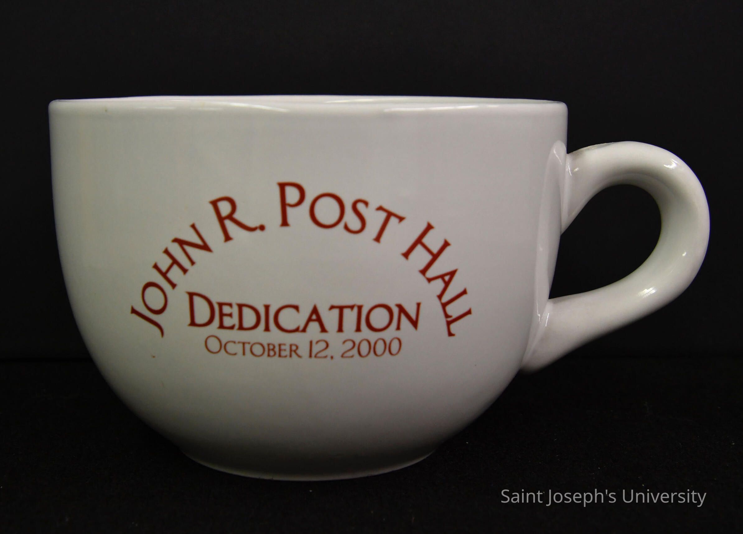Large white ceramic coffee mug with red lettering "SAINT JOSEPH'S UNIVERSITY" on one side and "JOHN R. POST HALL DEDICATION OCTOBER 12, 2000" on the other side. No markings on base.Made/Created