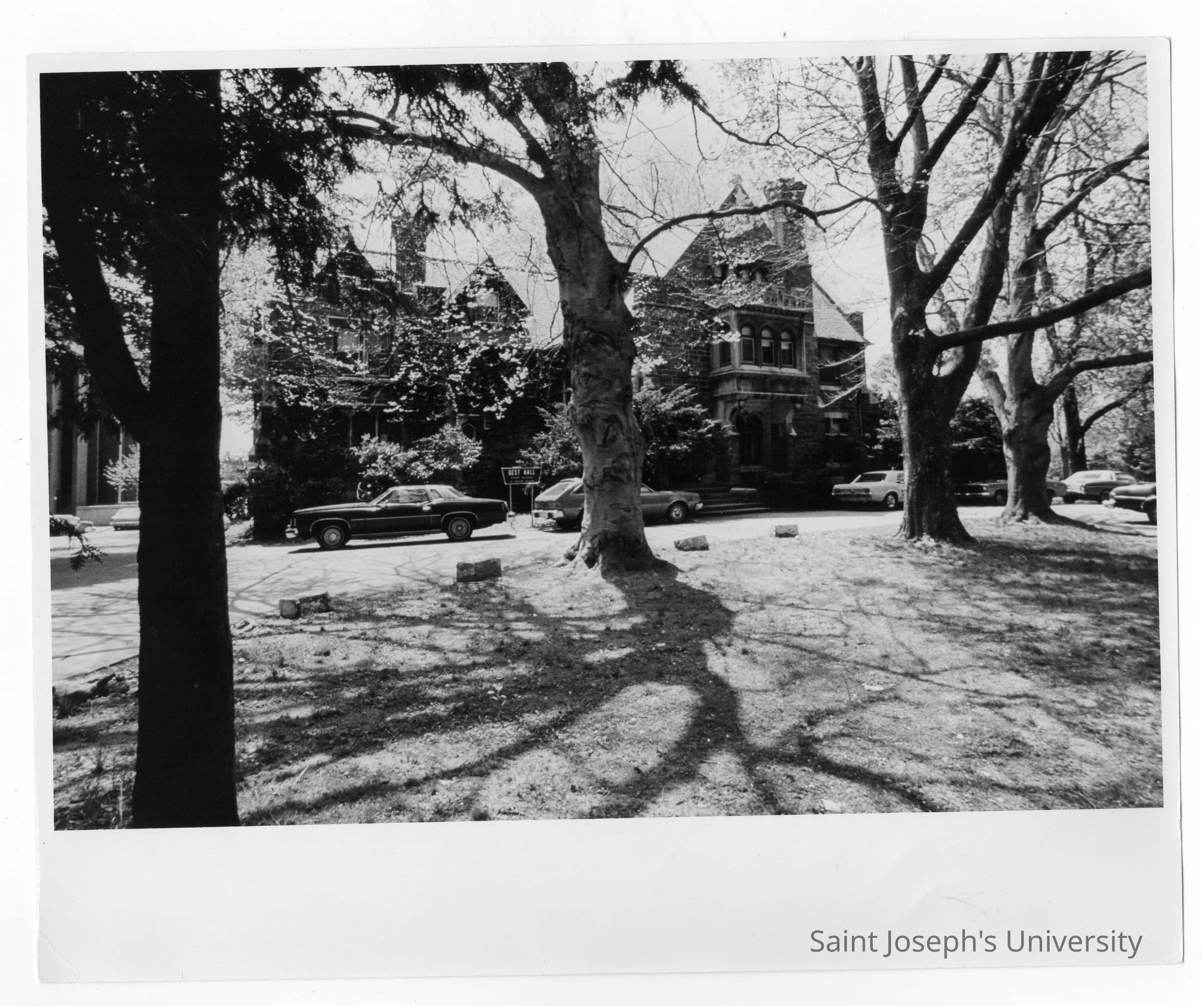 Exterior view of Wolfington Center (formerly Gest Estate, Neumann Hall) with cars parked in front.