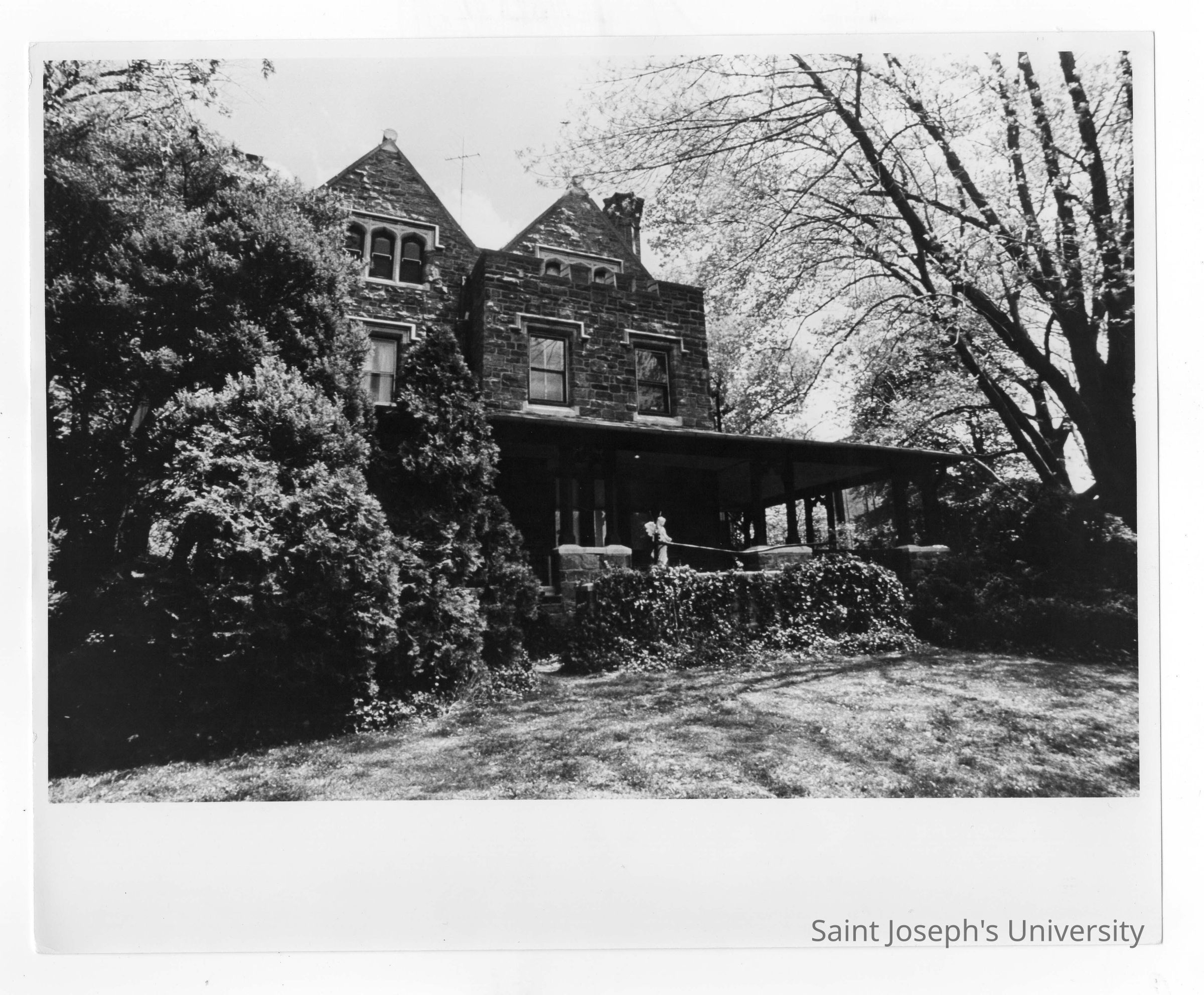 View of side porch of Wolfington Center (formerly Gest Estate, Neumann Hall) in spring.