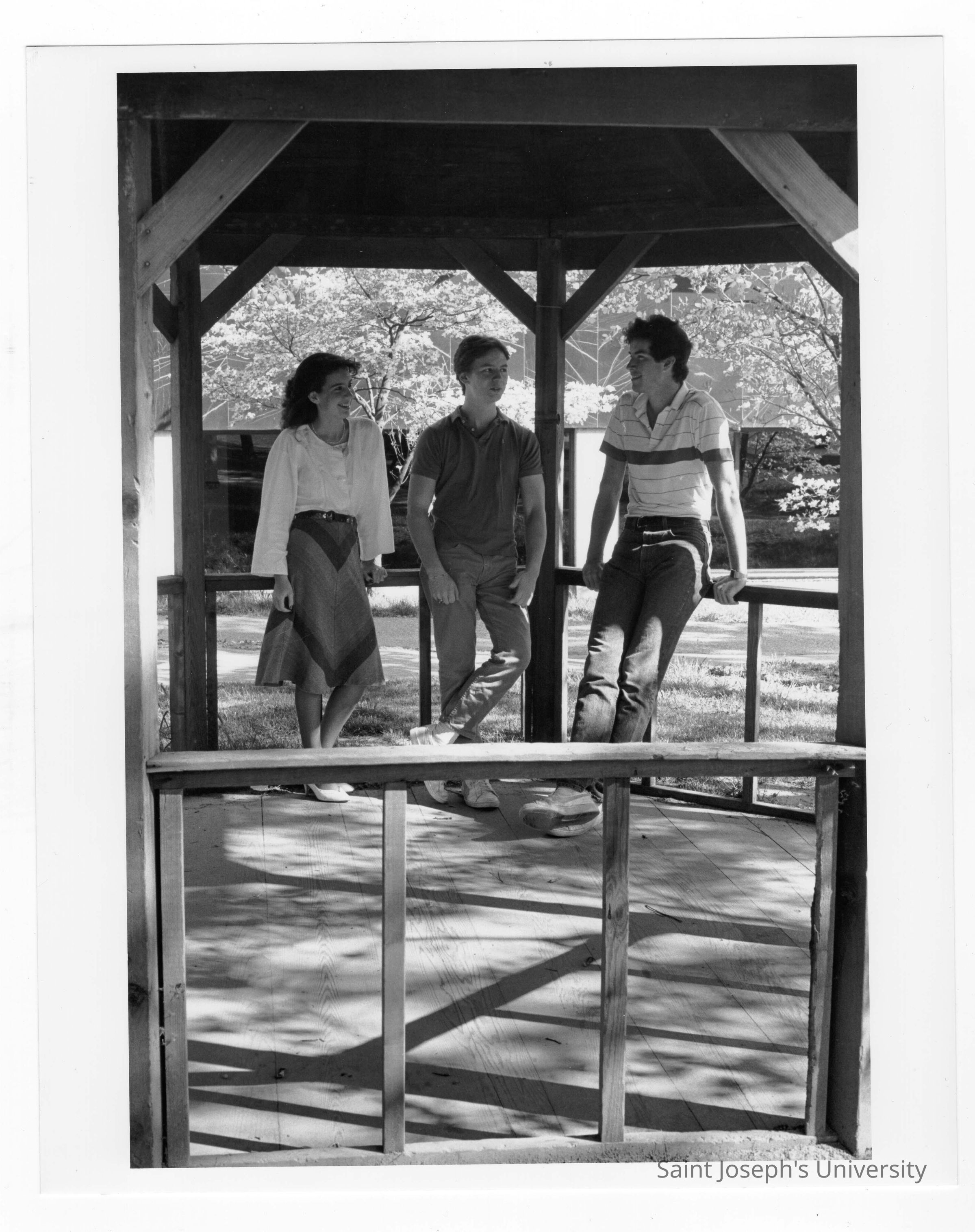 Students talking in gazebo of Gest Estate (now Wolfington Center) in spring. [not original structure; original made with tree limbs]
