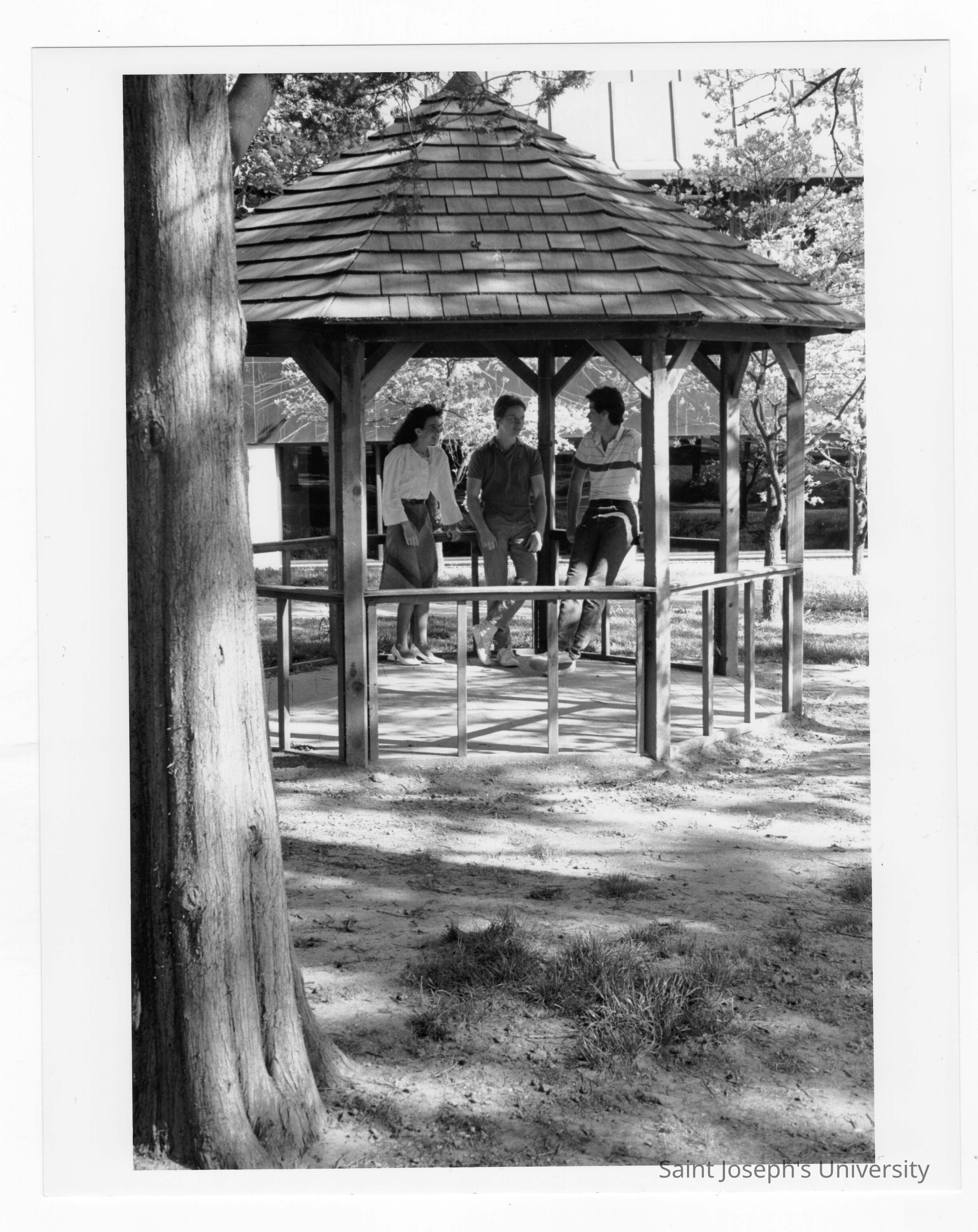 Students talking in gazebo of Gest Estate (now Wolfington Center) in spring. [not original structure; original made with tree limbs]