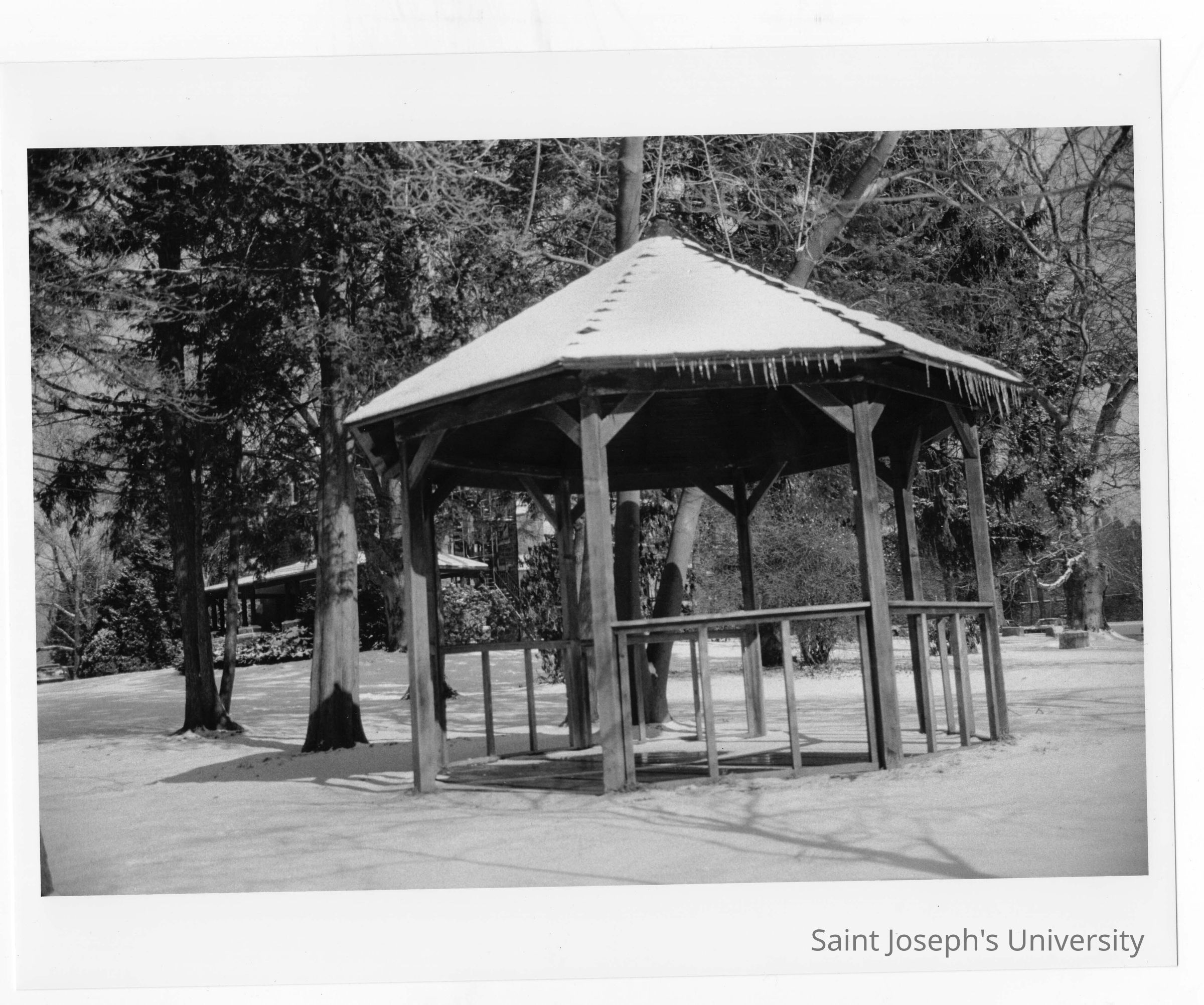 Gazebo of Gest Estate (now Wolfington Center) in winter with snow on ground. [not original structure; original made with tree limbs]