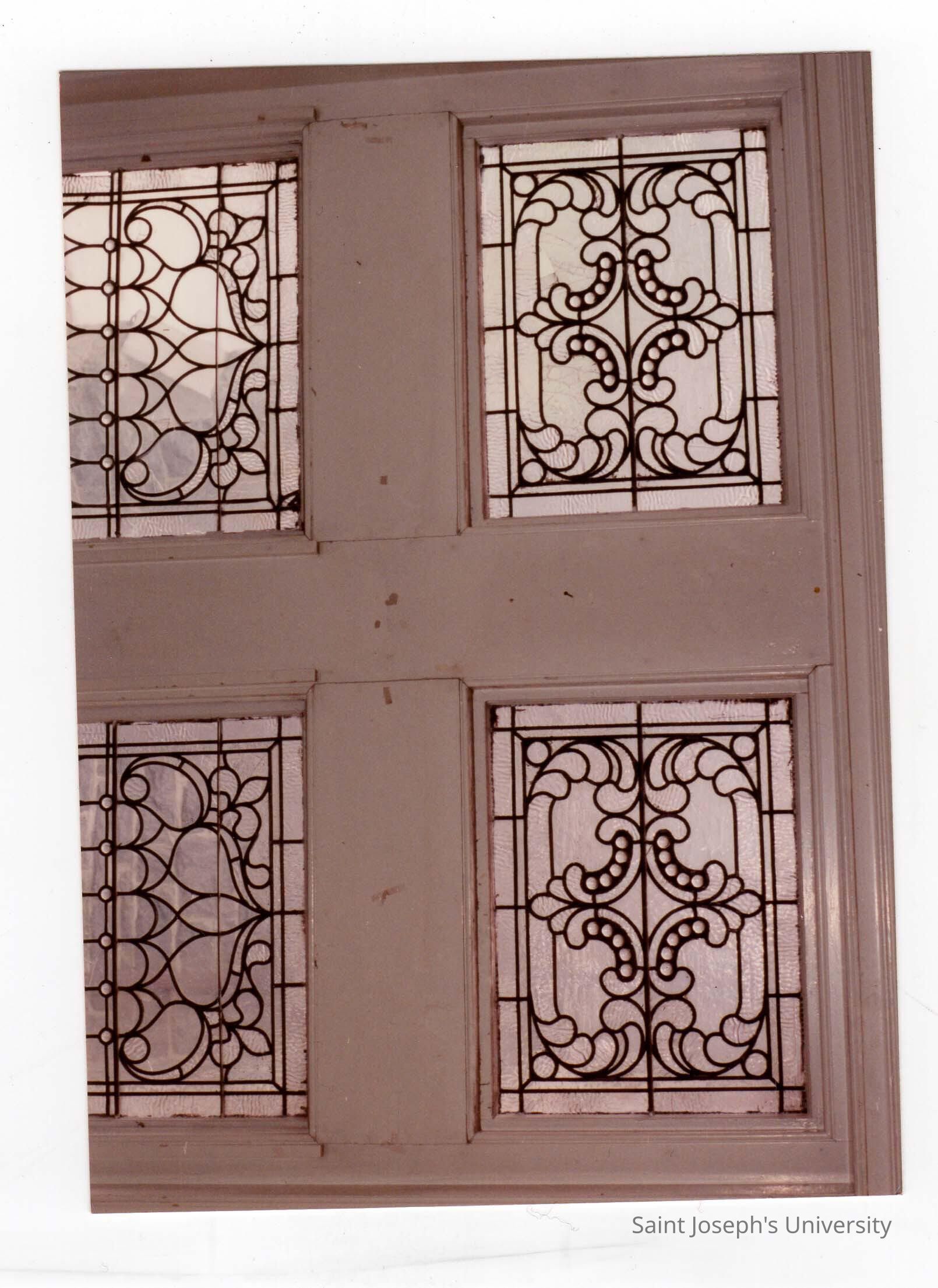 Interior view of leaded windows in stairway of Wolfington Center (formerly Gest Estate, Neumann Hall).