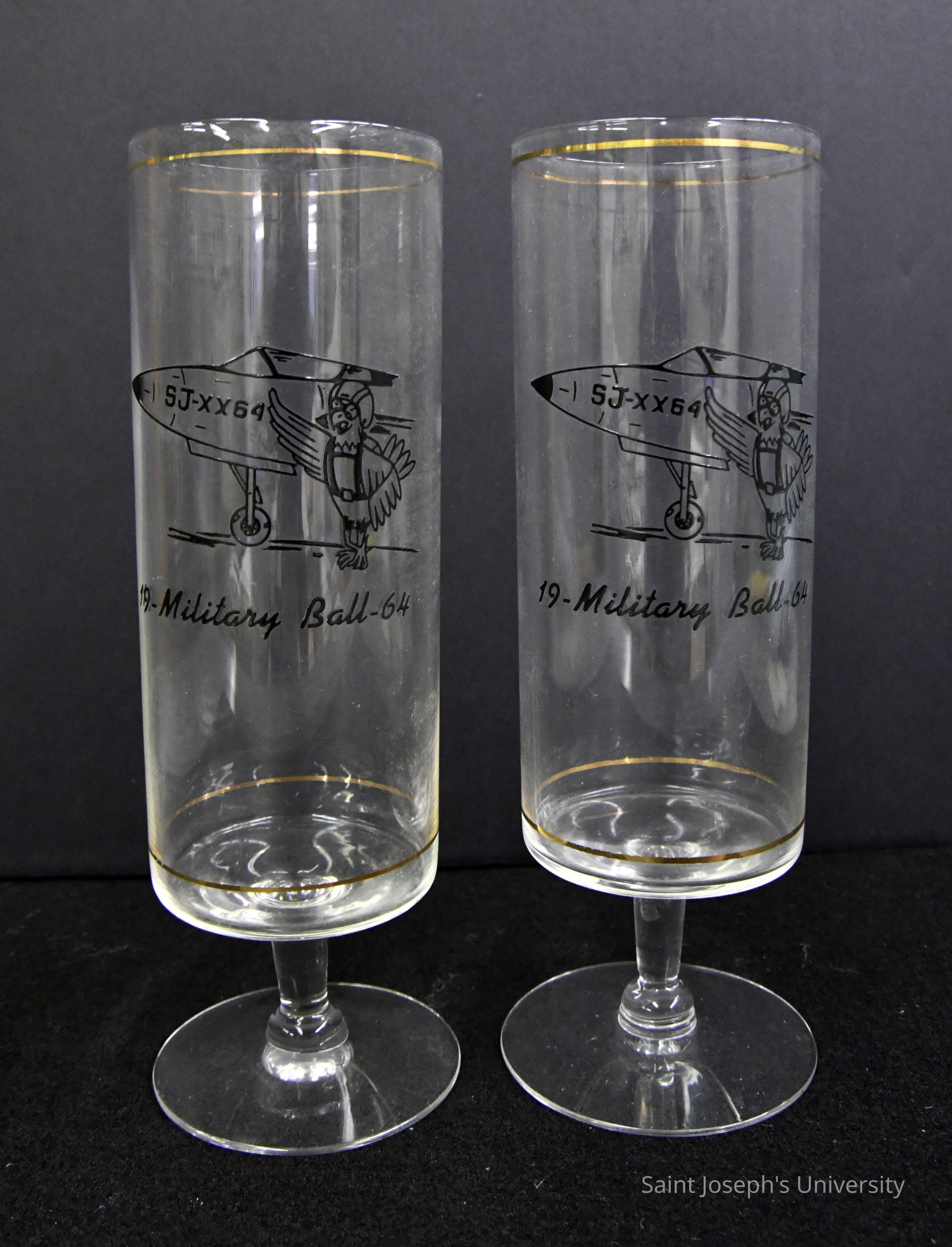 Pair of two drinking glasses or tumblers with stems. Gold bands are at the edge of the lip and base. Black ink image of the SJC hawk with a plane noting "1964 MILITARY BALL."Made/Created
