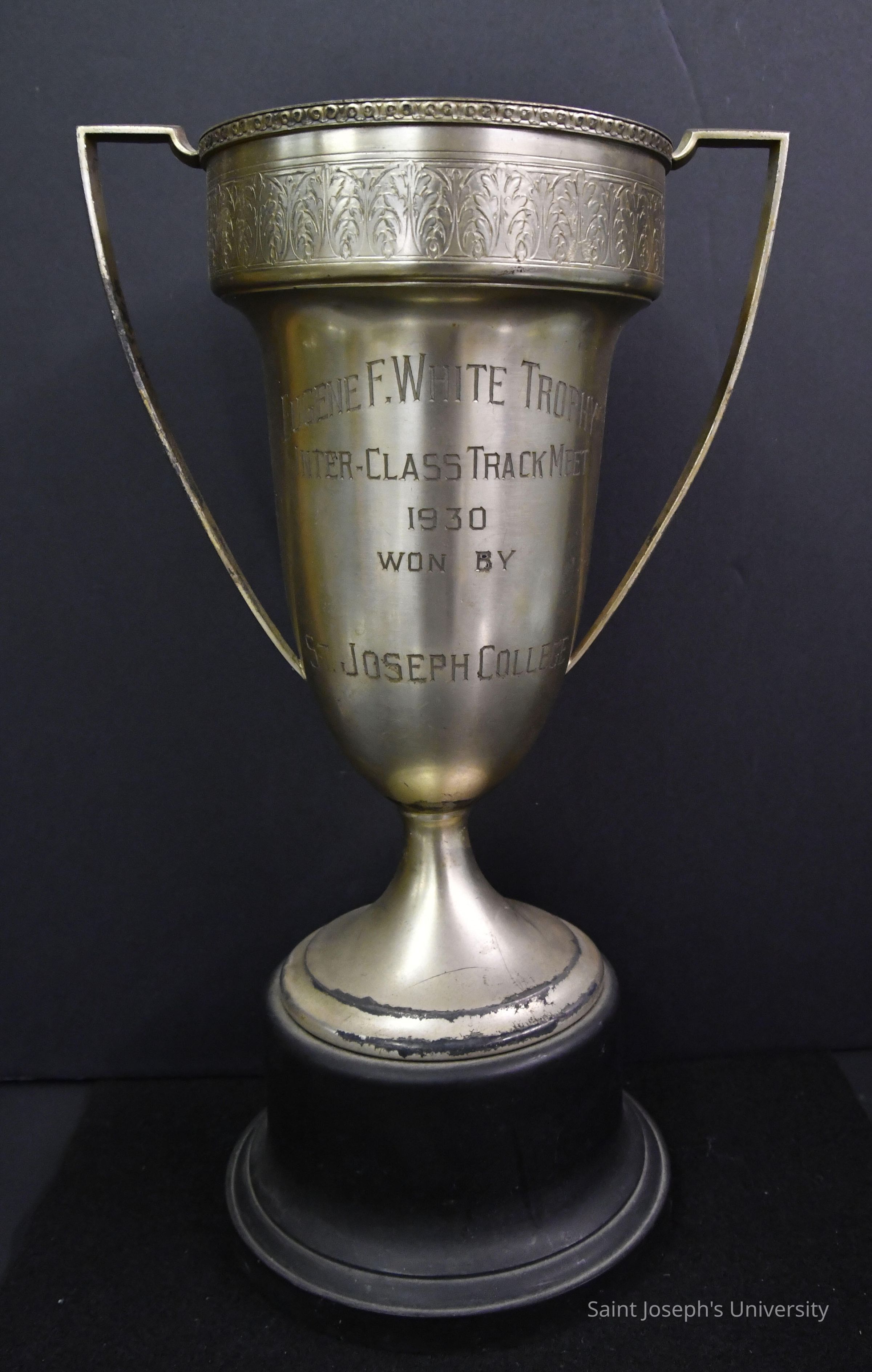 Tall double handle Grecian style silver trophy with plastic black base. Detail on the lip, decorative handles, and floral motif at trophy top. Engraved with the words "EUGENE F. WHITE TROPHY/ INTER-CLASS TRACK MEET/ 1930/ WON BY ST. JOSEPH COLLEGE."