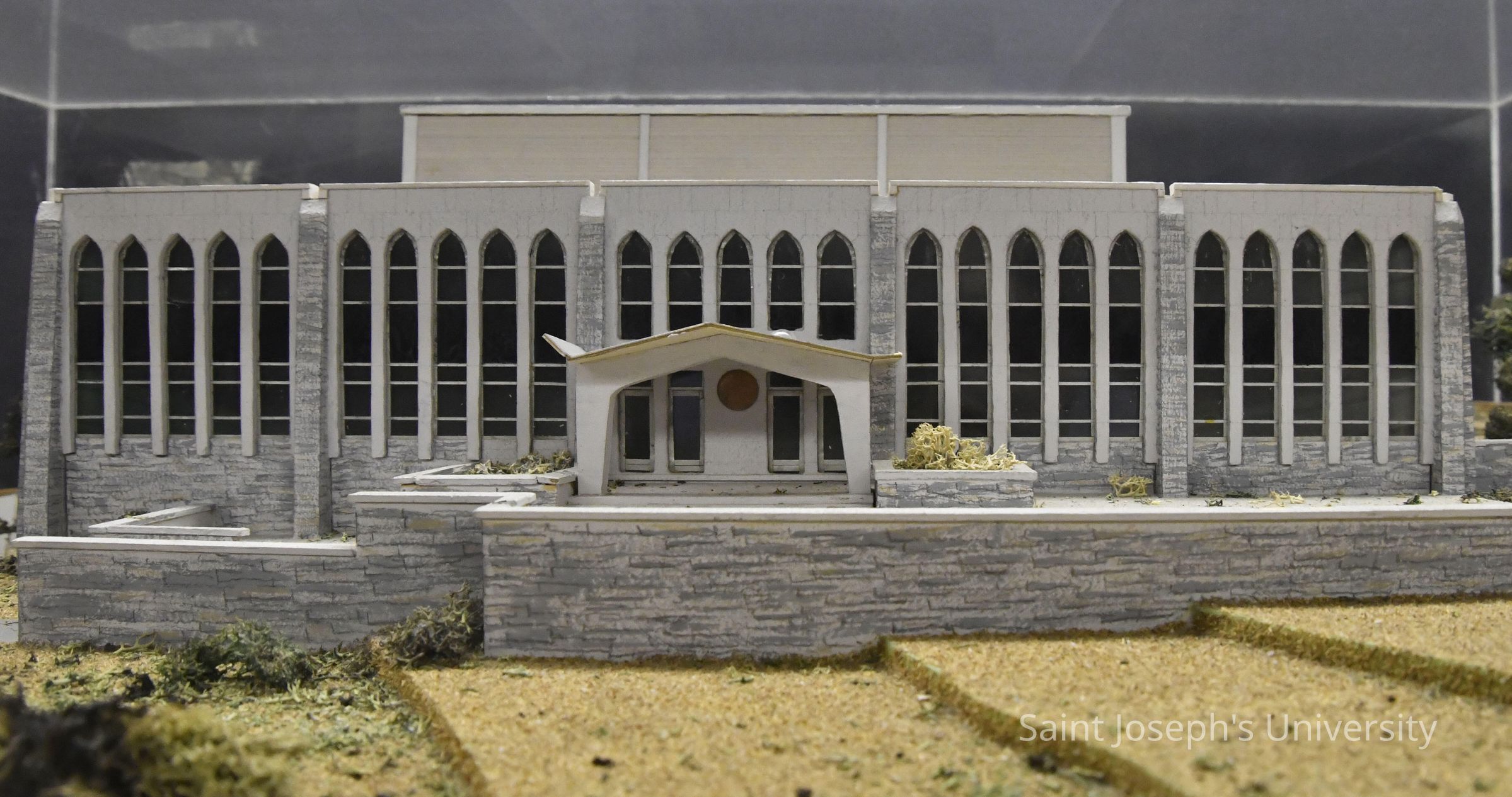 Three dimensional model of the Francis A. Drexel Library and surrounding tiered landscape. Composed of largely wood with some paper details, covered with a protective acrylic top case. A plastic plate notes "SAINT JOSEPH'S COLLEGE LIBRARY BUILDING/ DAGIT ASSOCIATES/ ARCHITECTS/ PHILADELPHIA, PA."Made/Created