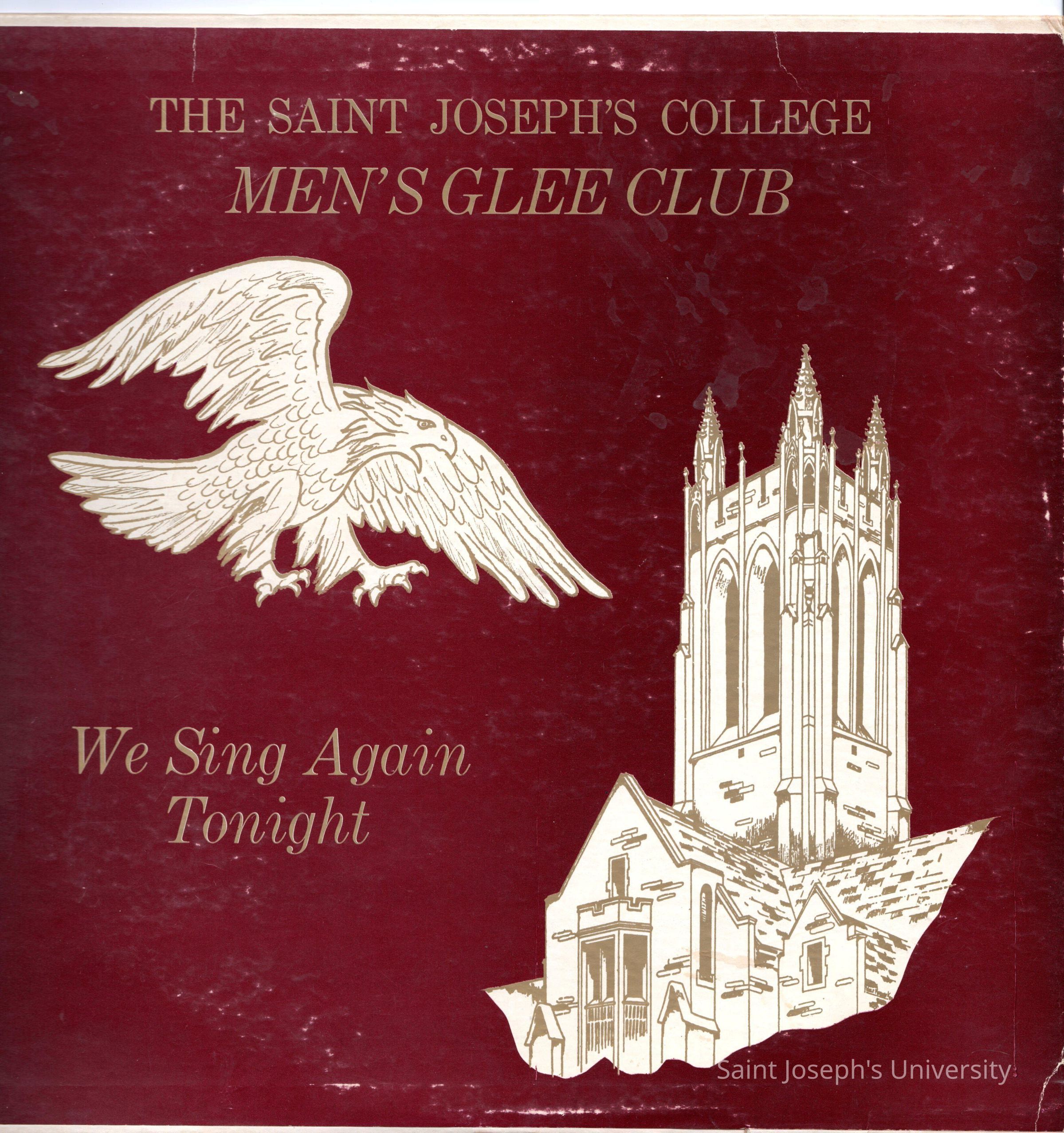 SJC Glee Club album 'We Sing Again Tonight' with crimson album cover with images of the hawk mascot and Barbelin. ca. 1965.