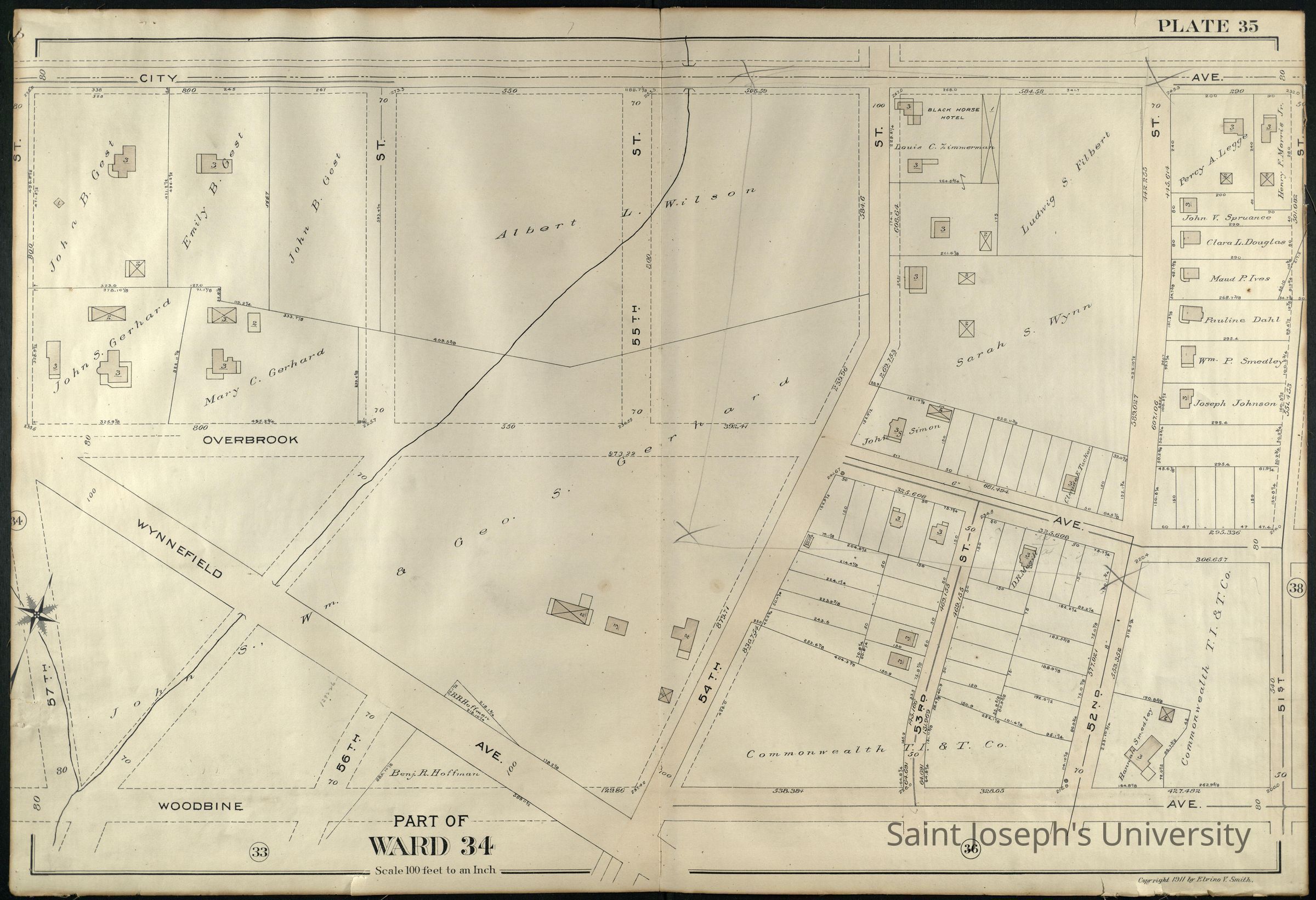 Deframed 1911 map of Philadelphia, Plate 35, Ward 34 depicting the vicinity between City Line Avenue, 54th Street, Overbook, and Wynnefield Avenues.