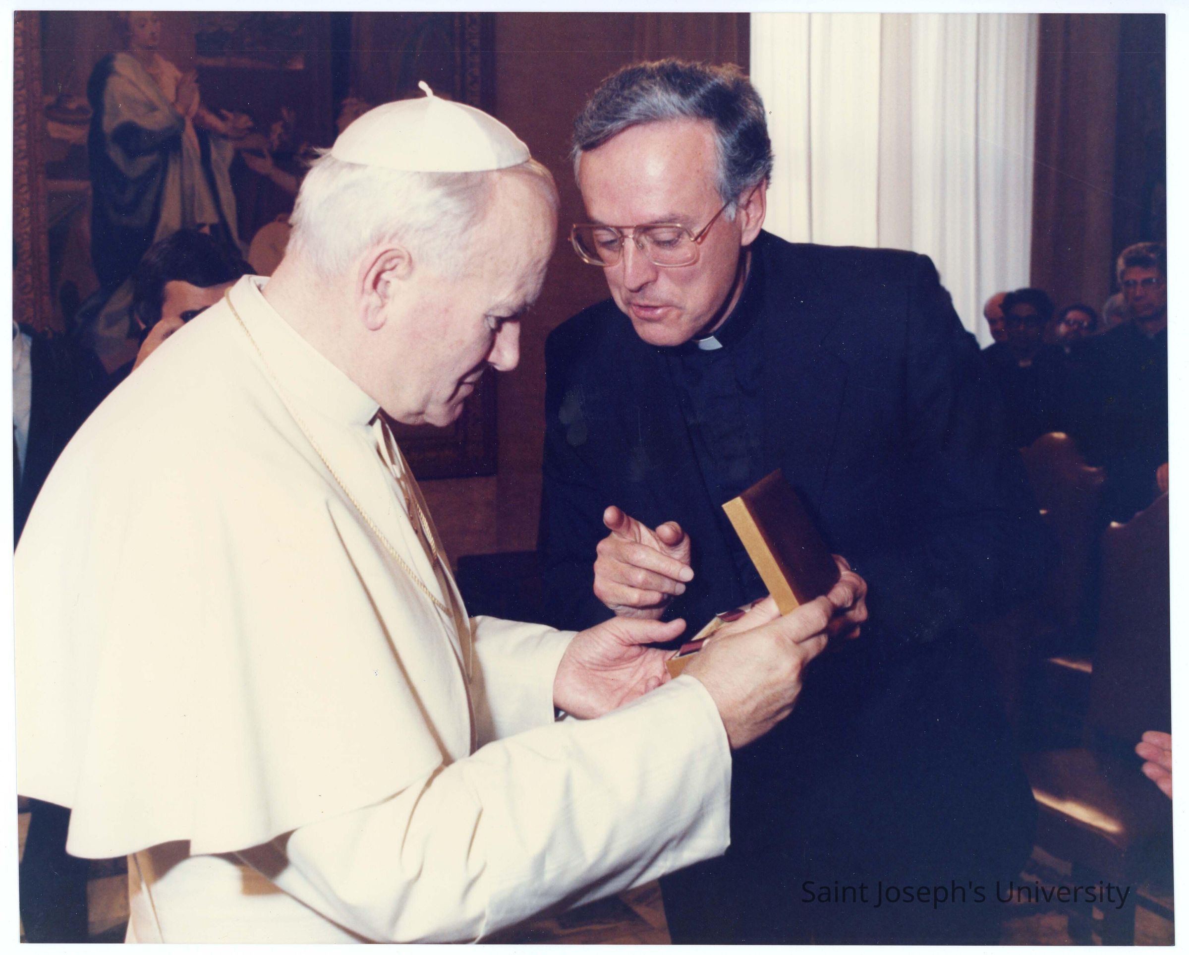 Donald I. MacLean, S.J., presenting commemorative medal to Pope John Paul II in Rome, 1985.
