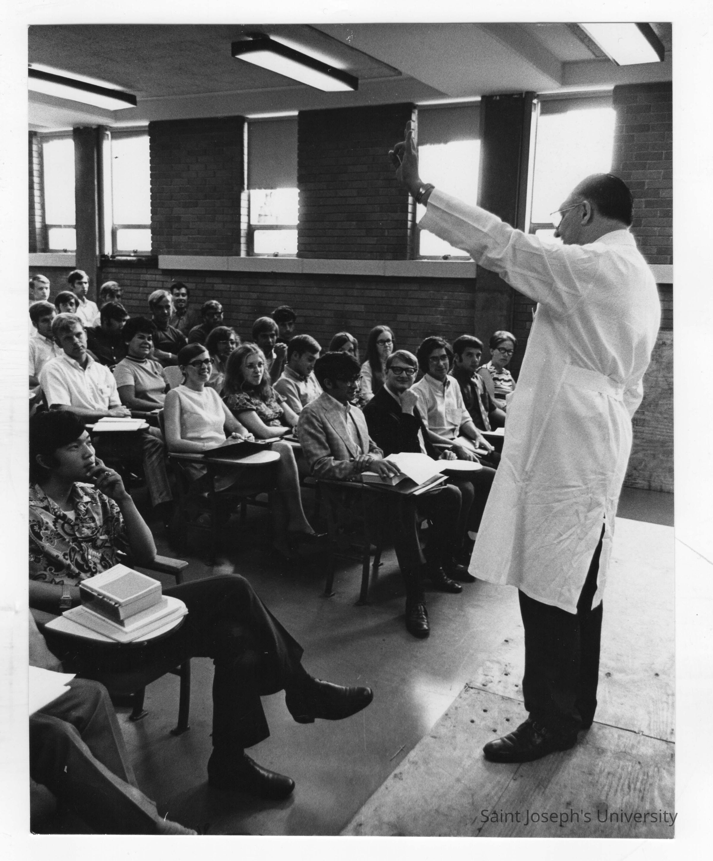 Louis S. Marks (Biology) standing in front bookcase wearing lab coat; and Louis S. Marks teaching a class.
