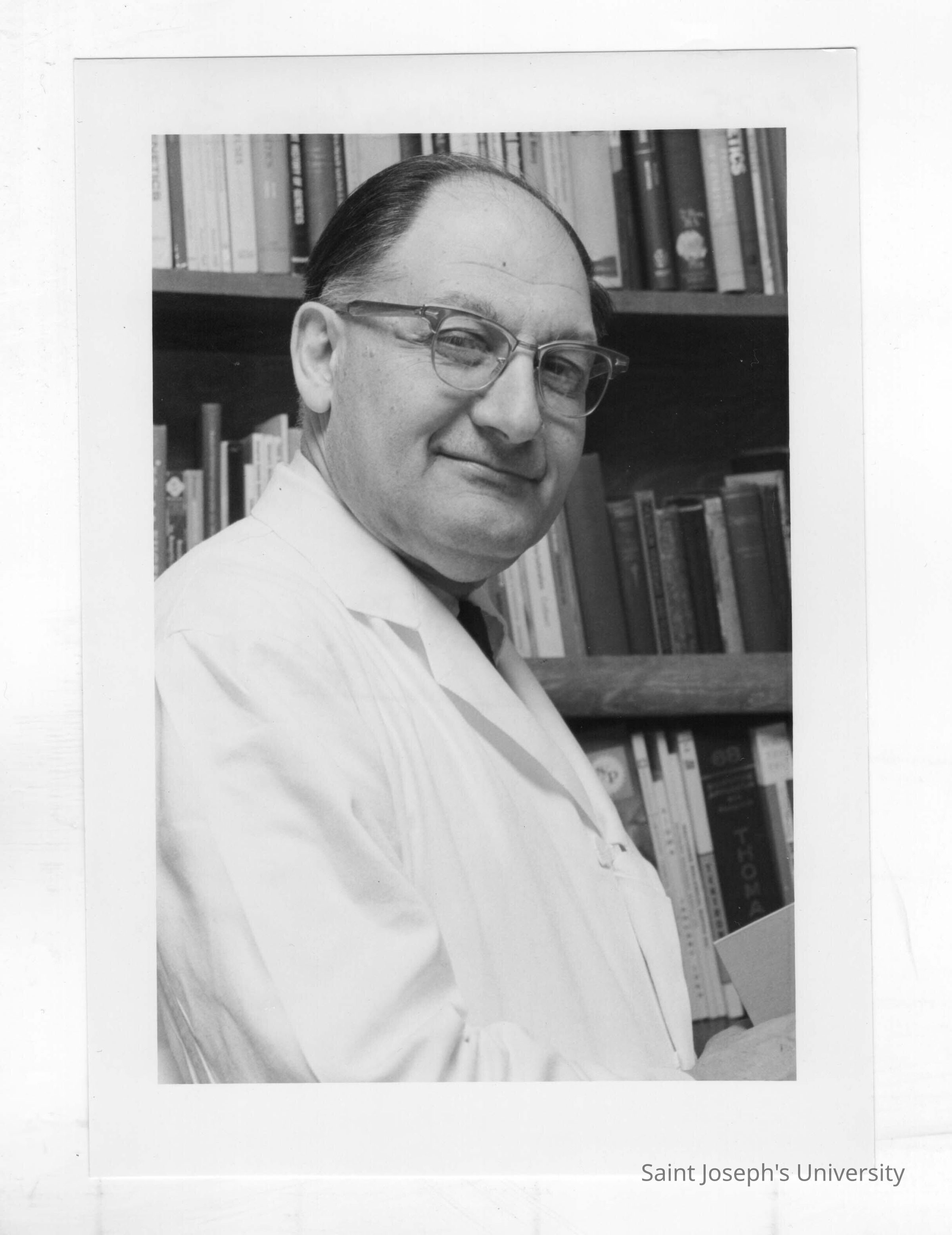 Louis S. Marks (Biology) wearing lab coat standing in front of bookcase; and Louis S. Marks in laboratory.