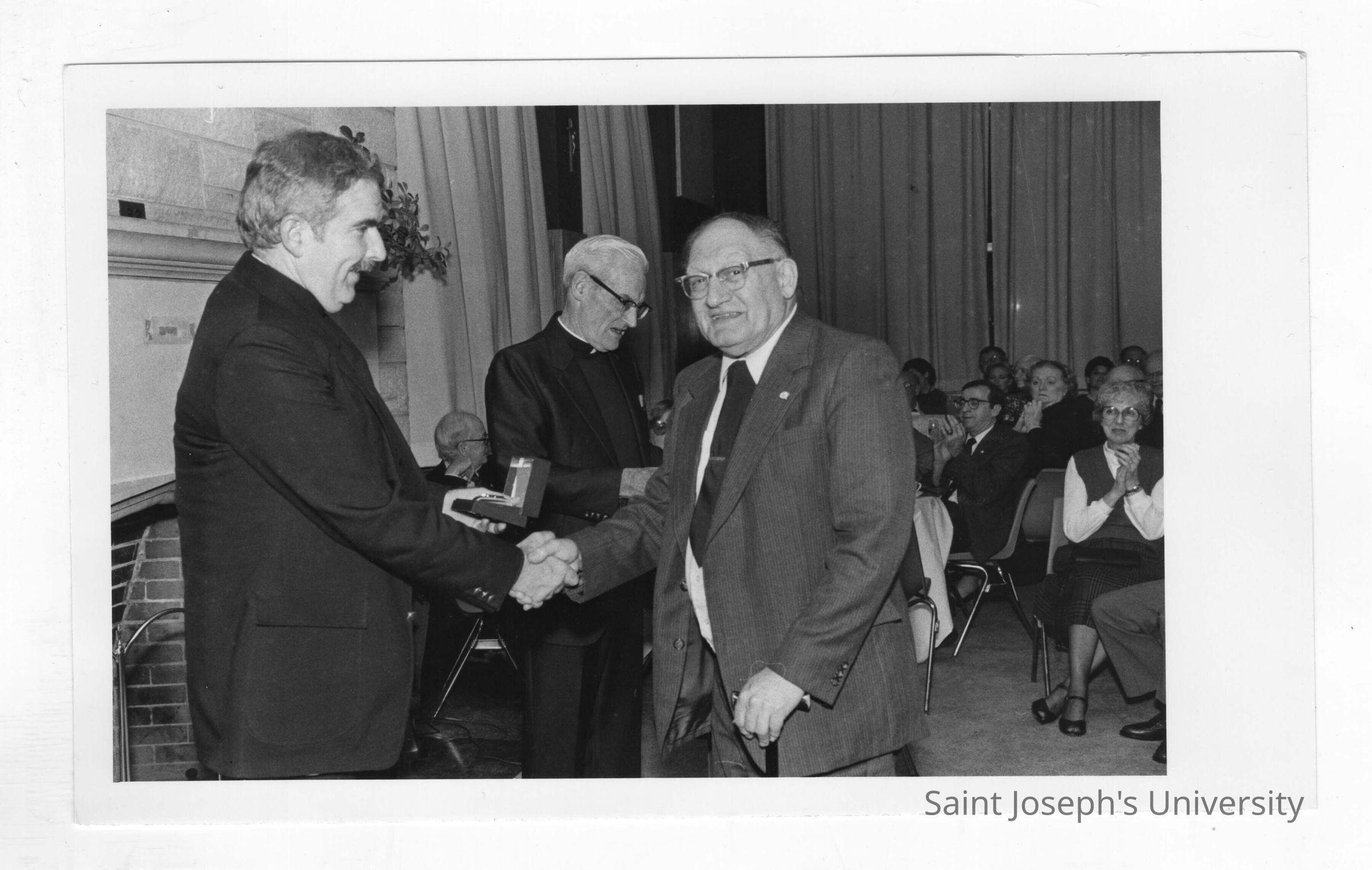 Louis S. Marks (Biology) receiving award from Nicholas S. Rashford, S.J., with Michael Smith, S.J., standing in background.
