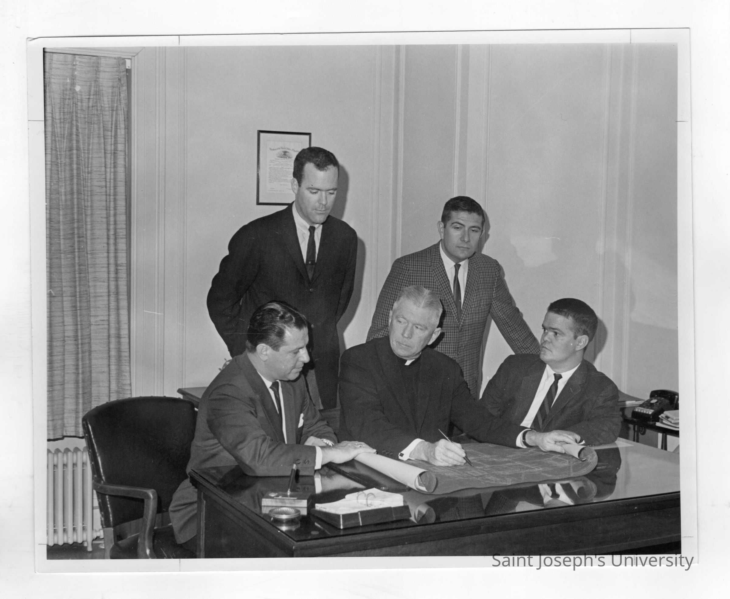Lawrence R. McHugh, S.J., with Joseph Pascucci and others looking at blueprints.