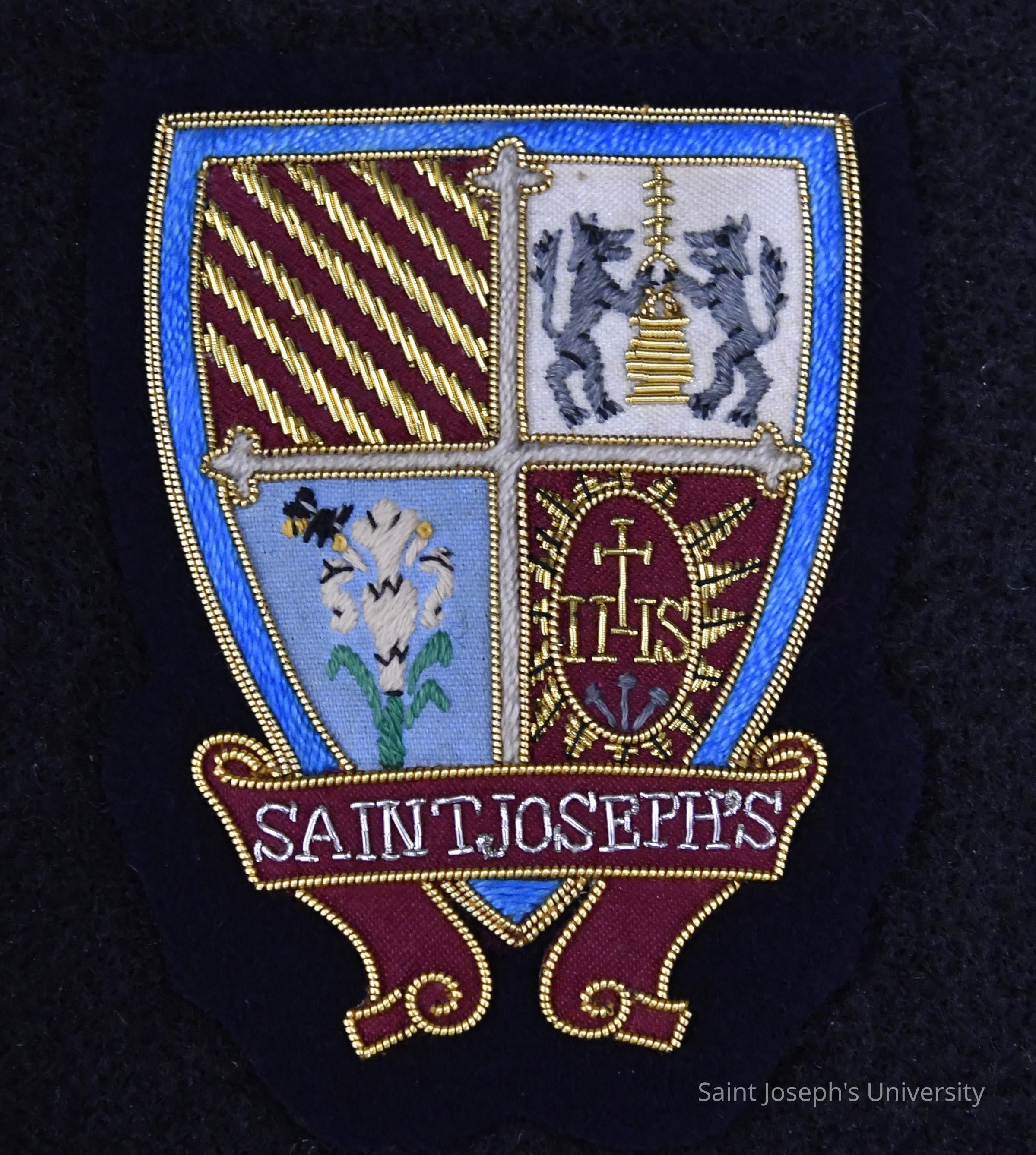 Thirteen colorful SJU shield patch pins. Metal coils compose of "SAINT JOSEPH'S." Souvenir from the 2001 Sesquicentennial celebration. Include three pins each on back.