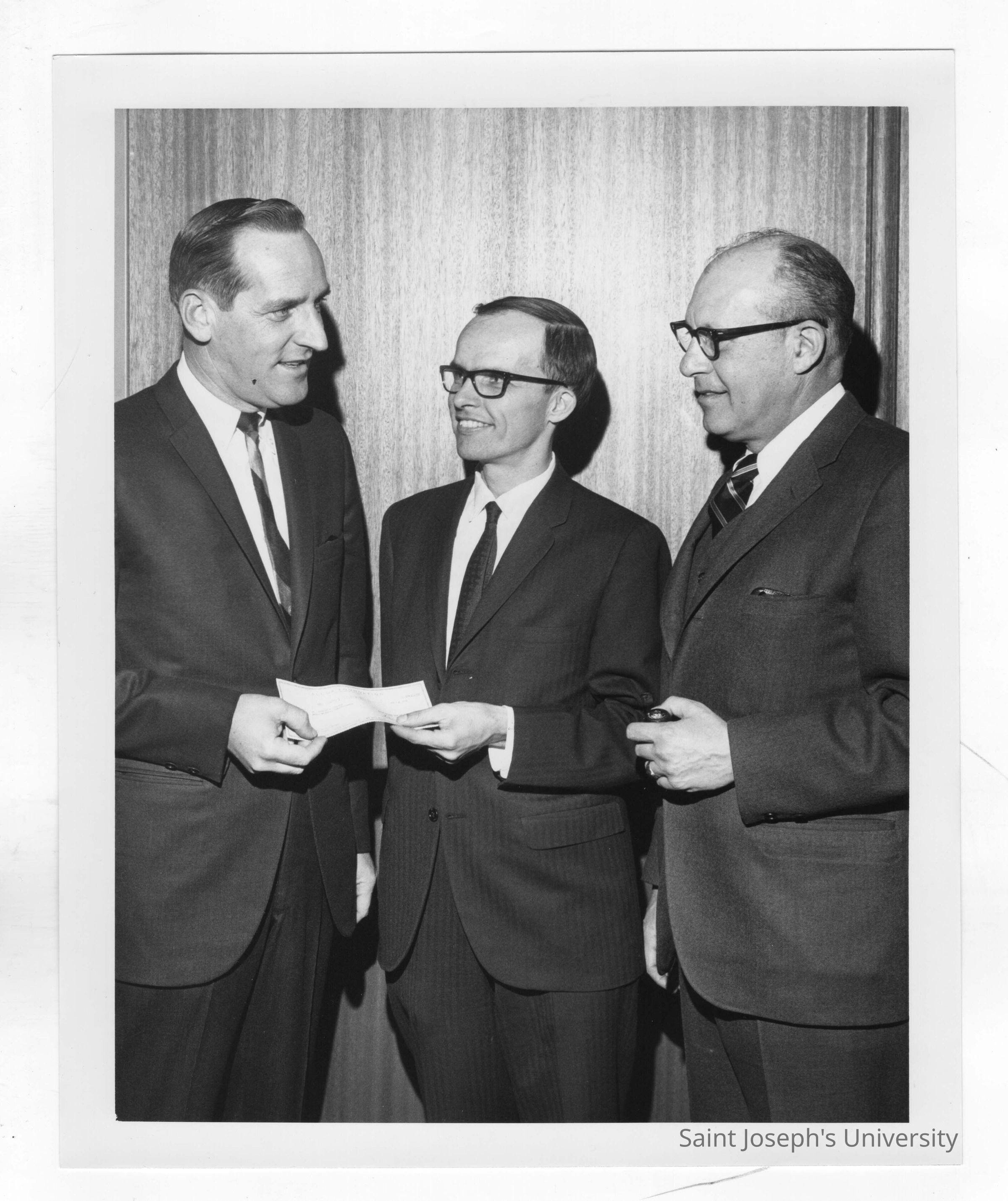 Harold S. Ricker (Food Marketing), one sitting at desk and the other with Ricker receiving check from two unidentified individuals.