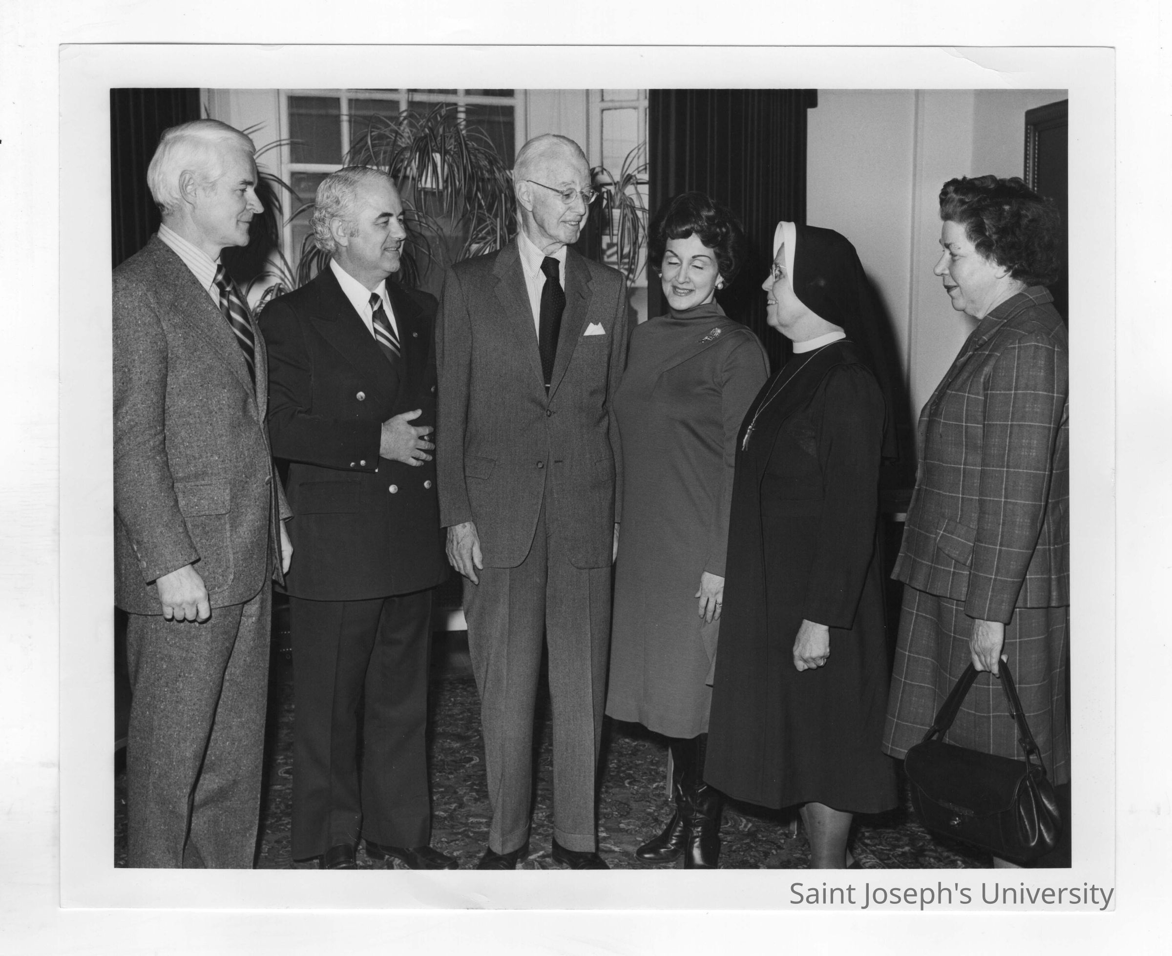 Charles F. Shreiner (Latin American Studies Program) with Ellsworth Bunker, Hugh Monaghan, Hon. Luz Maria Murray, Sister Mary Consuela, I.H.M., and Elizabeth Laws attending "Export American Friendship" luncheon, Feb 1978. (Panama Canal treaties debate)Entry/Object ID