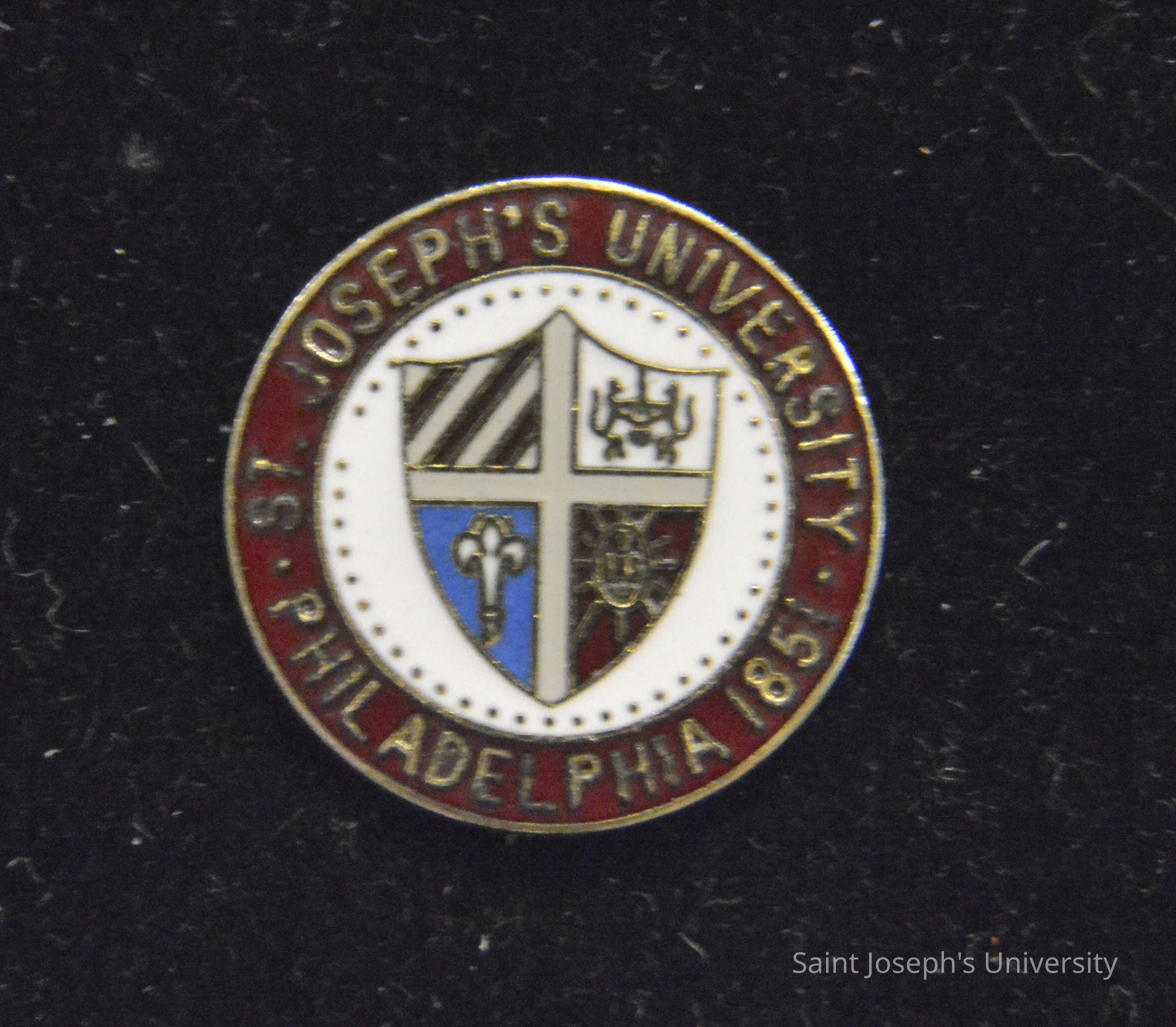 Two small round brass colored tie tacks or pins with the SJU seal in enamel with multiple colors.