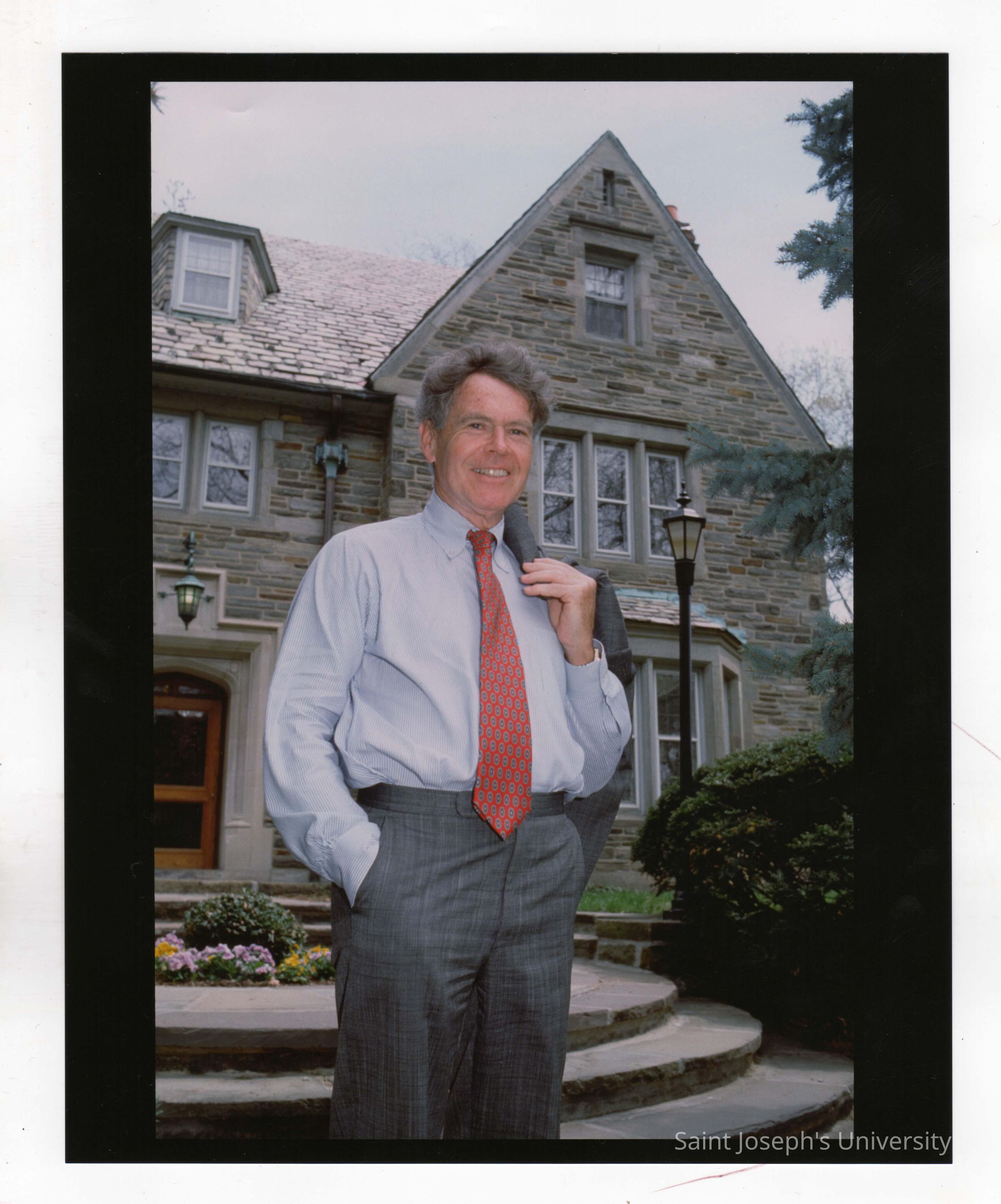 Michael J. Morris (Board of Trustees) standing in front of Regis Hall.