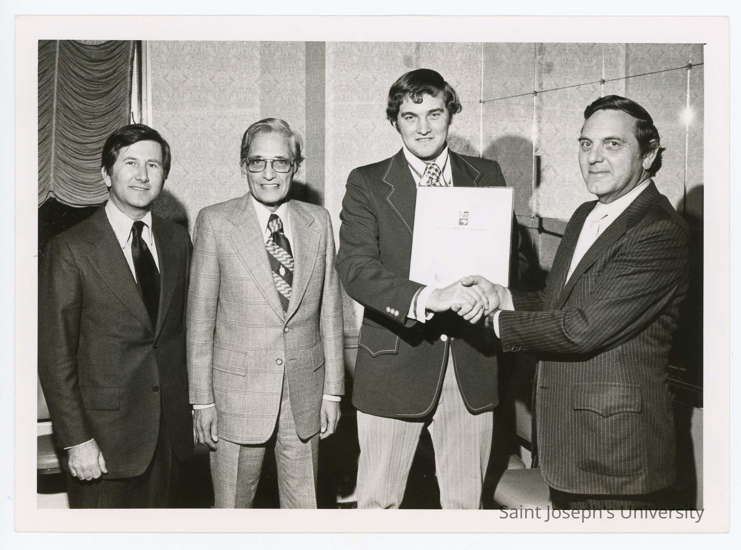 Leonard J. Barol, instructor for SJC course, Packaging to Sell, held on December 11, 1973. Also pictured are student Charles E. Hopkins, and Norman T. Baldwin of the National Paper Box Association.