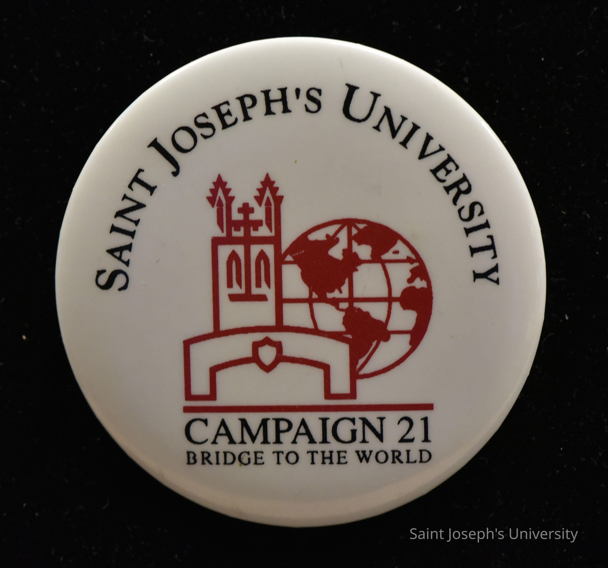 Round button with a white background and an image of the Barbelin tower and a globe in red. "SAINT JOSEPH'S UNIVERSITY" surrounds the graphic and "CAMPAIGN 21/ BRIDGE TO THE WORLD" is located below in black.
