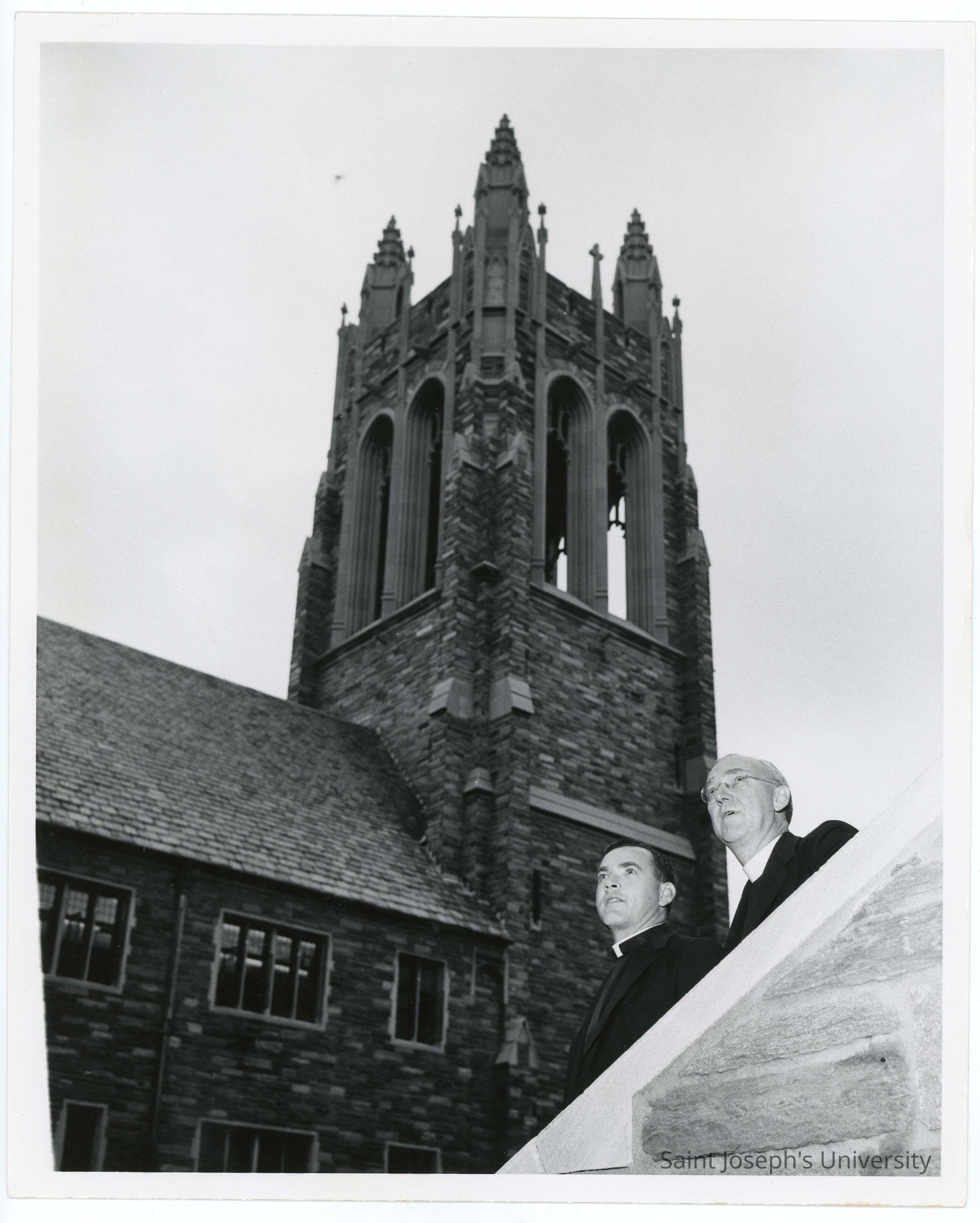 J. Joseph Bluett, S.J., (President) standing with another individual on steps with Barbelin tower in background.