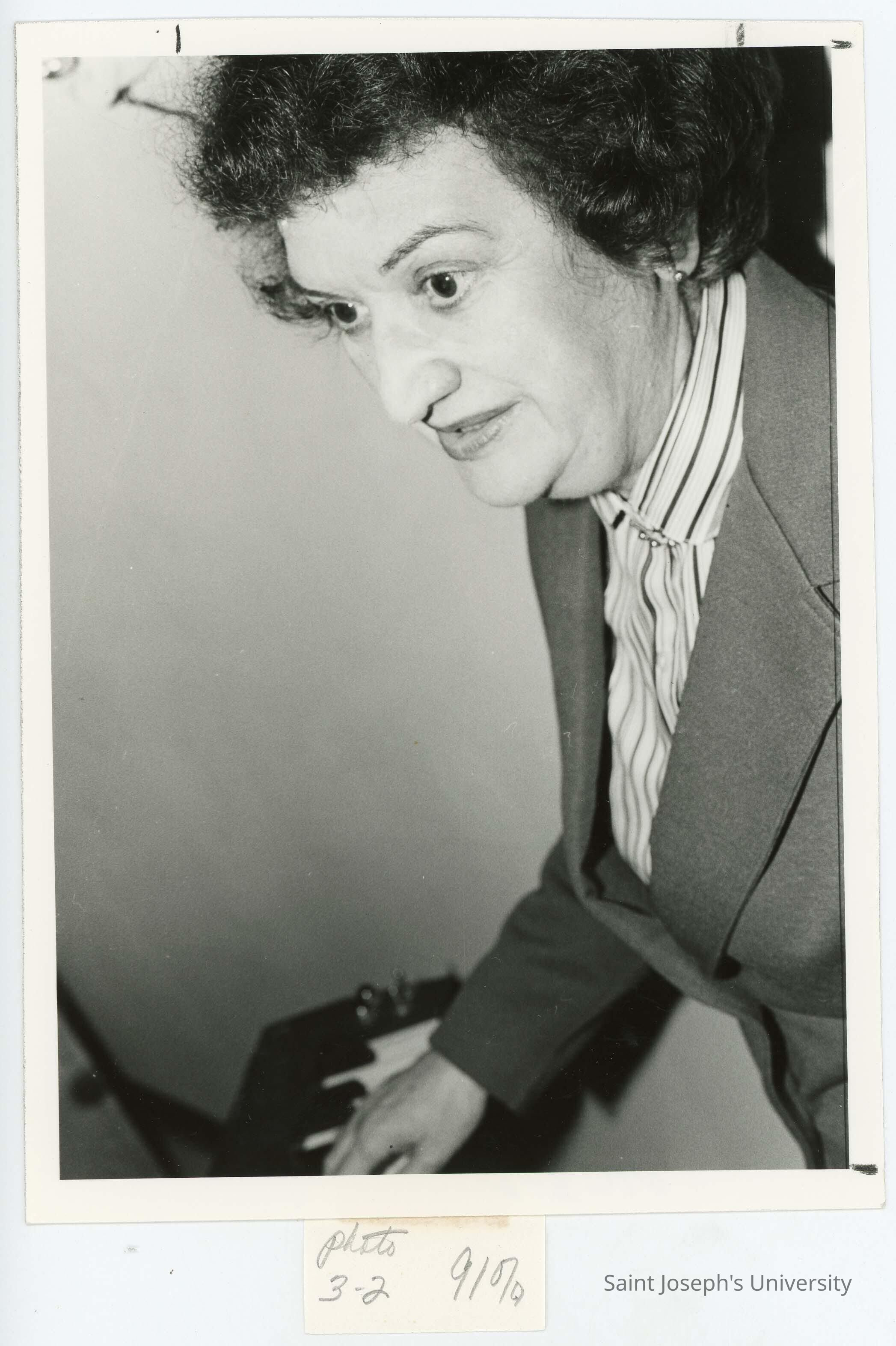 Madeline M. Conti: Administrative Assistant to the President. She is working the electrical board to ring the bells in Barbelin Hall tower. Accompanying contact sheet has photos of construction of Library addition.