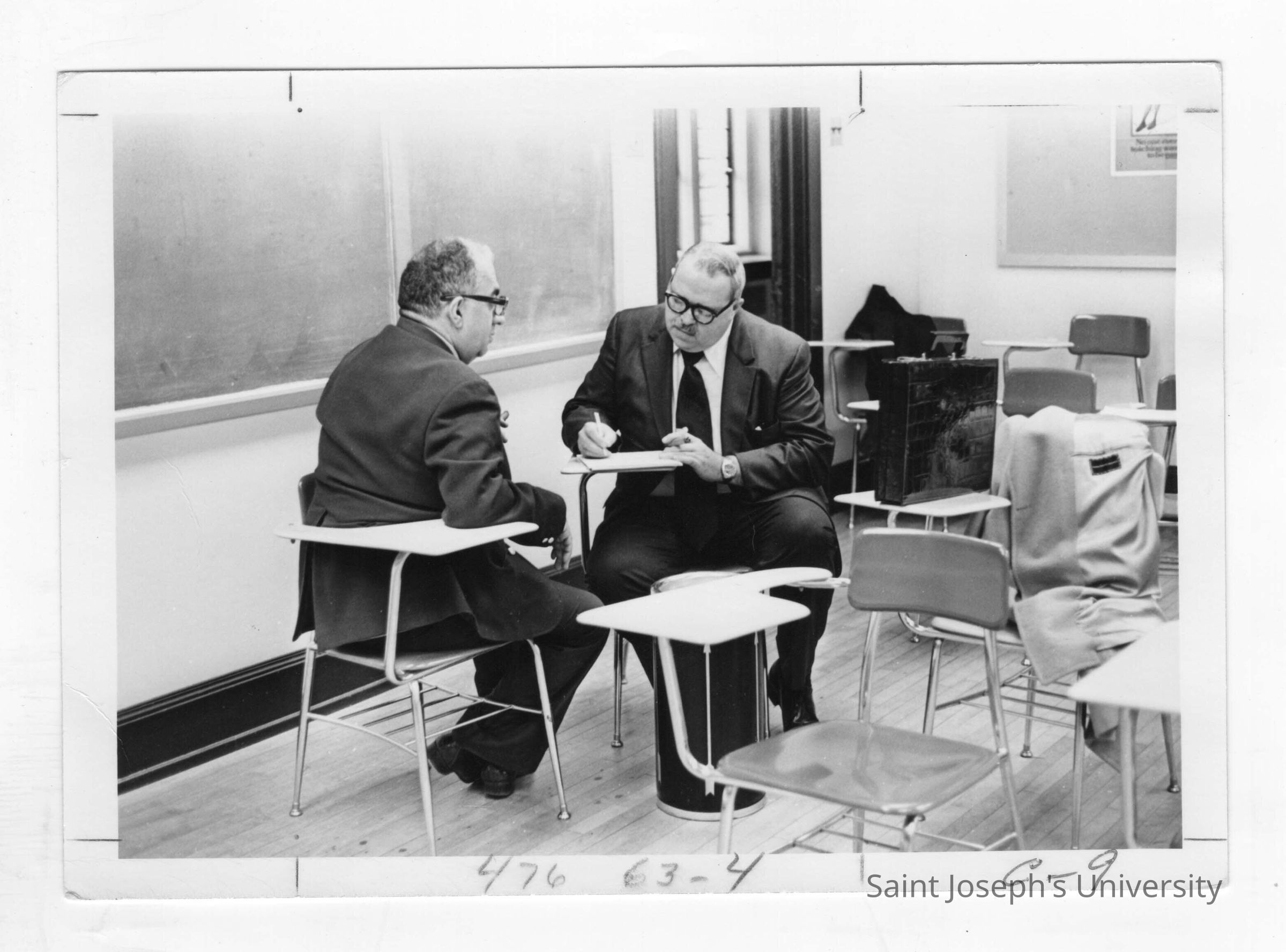 Thomas E. Leaver: Faculty, Accounting; member of SJC's Council on Business Ethics. Also in photo is Joseph J. George, Faculty, English.