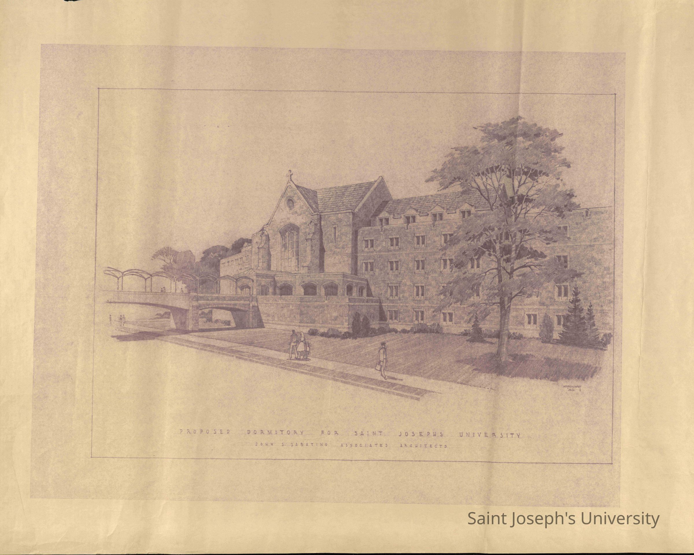 Two copies (various sizes) of an artist rendering titled Proposed Dormitory for Saint Joseph's University (McShain Hall) by Normart for John S. Sabatino Architects, 1986. The drawing includes a perspective view of the south elevation of McShain Hall and bridge.Made/Created