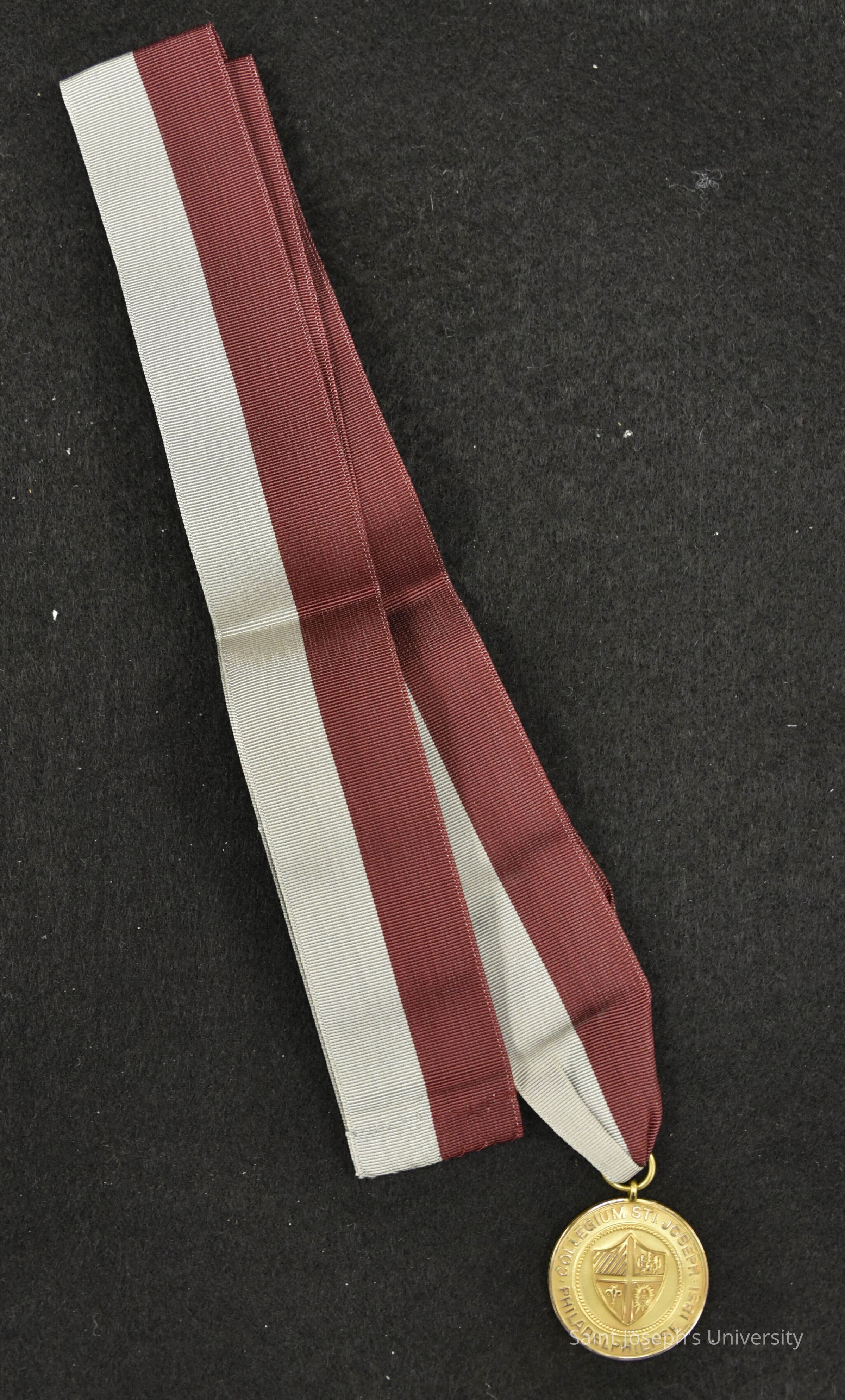 A Golden Hawk medal on crimson and gray ribbon. The gold filled medal includes the school shield on the front and is engraved on the backside with "GEORGE J./ CLARKE/ 1923-1973." George J. Clarke graduated from Saint Joseph's Prep in 1919 and SJC in 1923.