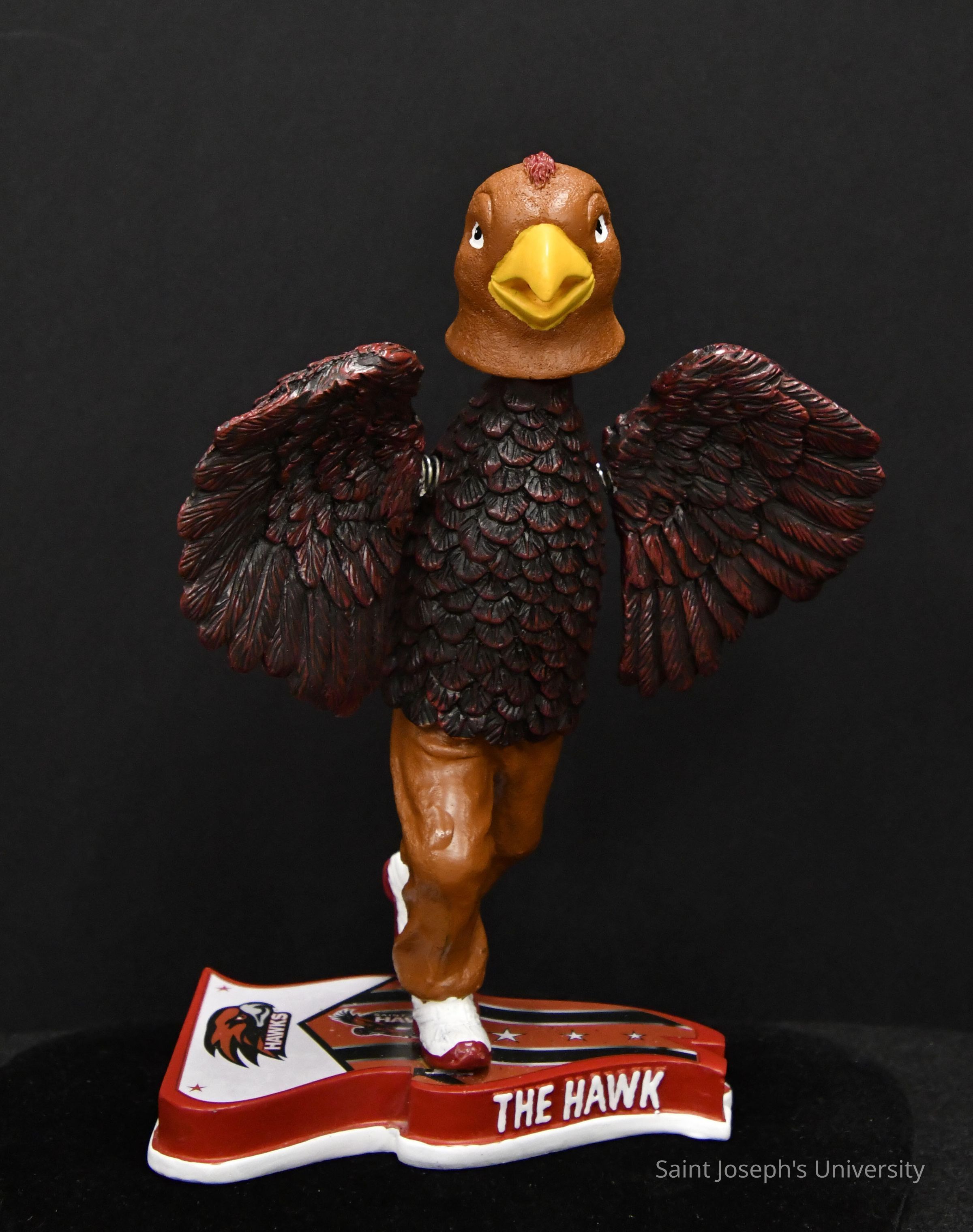Painted resin bobble head caricature doll of SJU's Hawk mascot in original packaging. The Hawk has a moveable head with outstretched wings and rests on a stand. Number 74 of 144 made by Forever Collectibles. Circa 2010.Made/Created