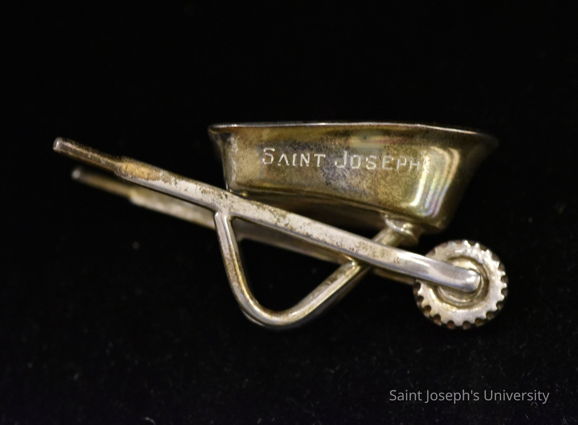 Small silver colored metal wheelbarrow and shovel commemorating the October 3, 1996 groundbreaking of Mandeville Hall. Owned by Fr. Nicholas Rashford, S.J. The wheelbarrow includes moving wheel and "OCTOBER 3, 1996" in the base of the bowl and "SAINT JOSEPH'S UNIVERSITY" around the outside of the bowl. Crimson and gray ribbons are attached to the shovel.Made/Created