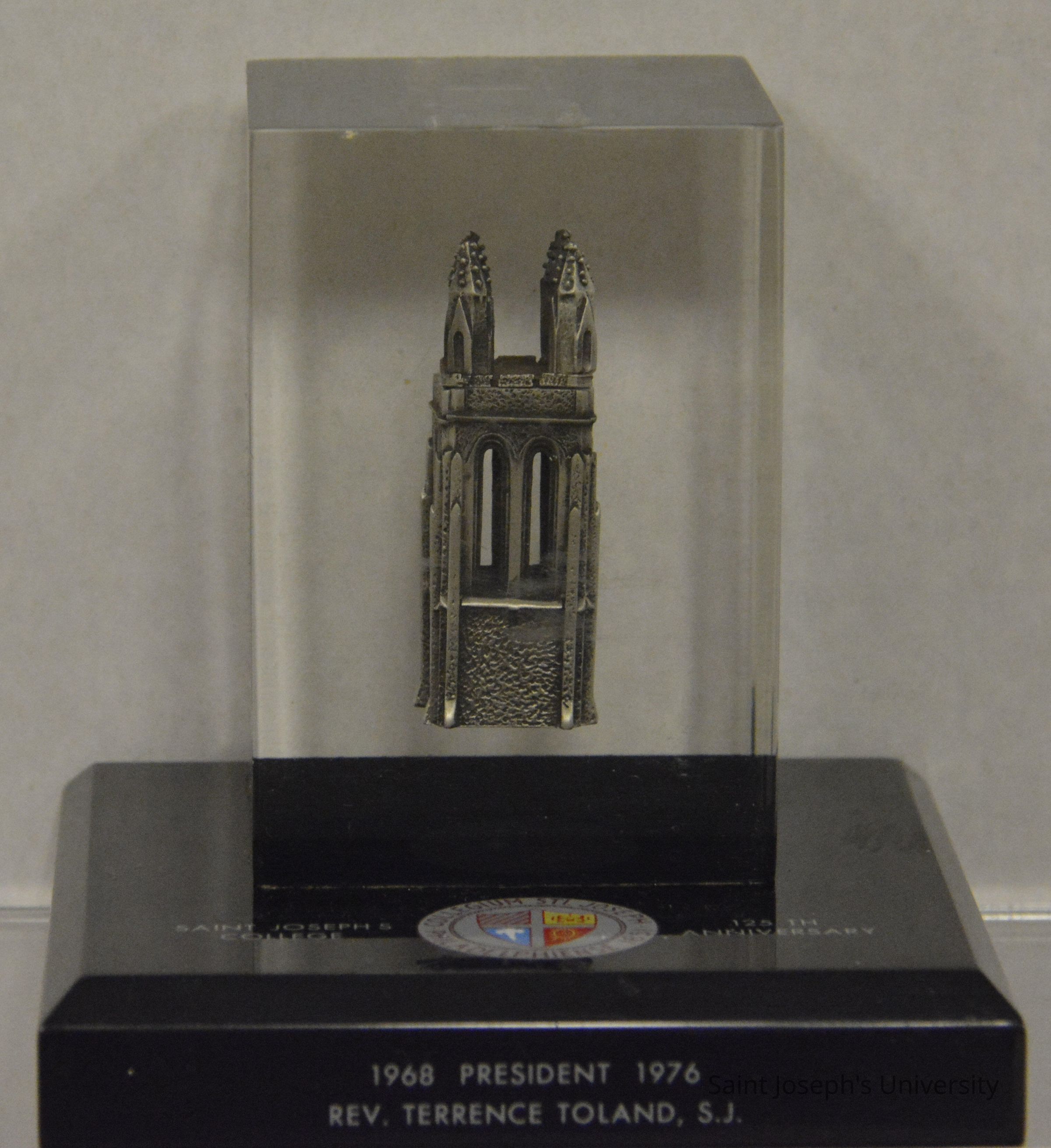 Commemorative resin award marking Father Terrence Toland's time as president of SJC. The award includes a black resin base with "Saint Joseph's College/ 125th Anniversary" and school seal on the base top. "1968/ President/ 1976/ Rev. Terrence Toland, S.J." is located on the side of the base. A clear resin pillar juts out of the base and includes a pewter colored miniature of the Barbelin tower.