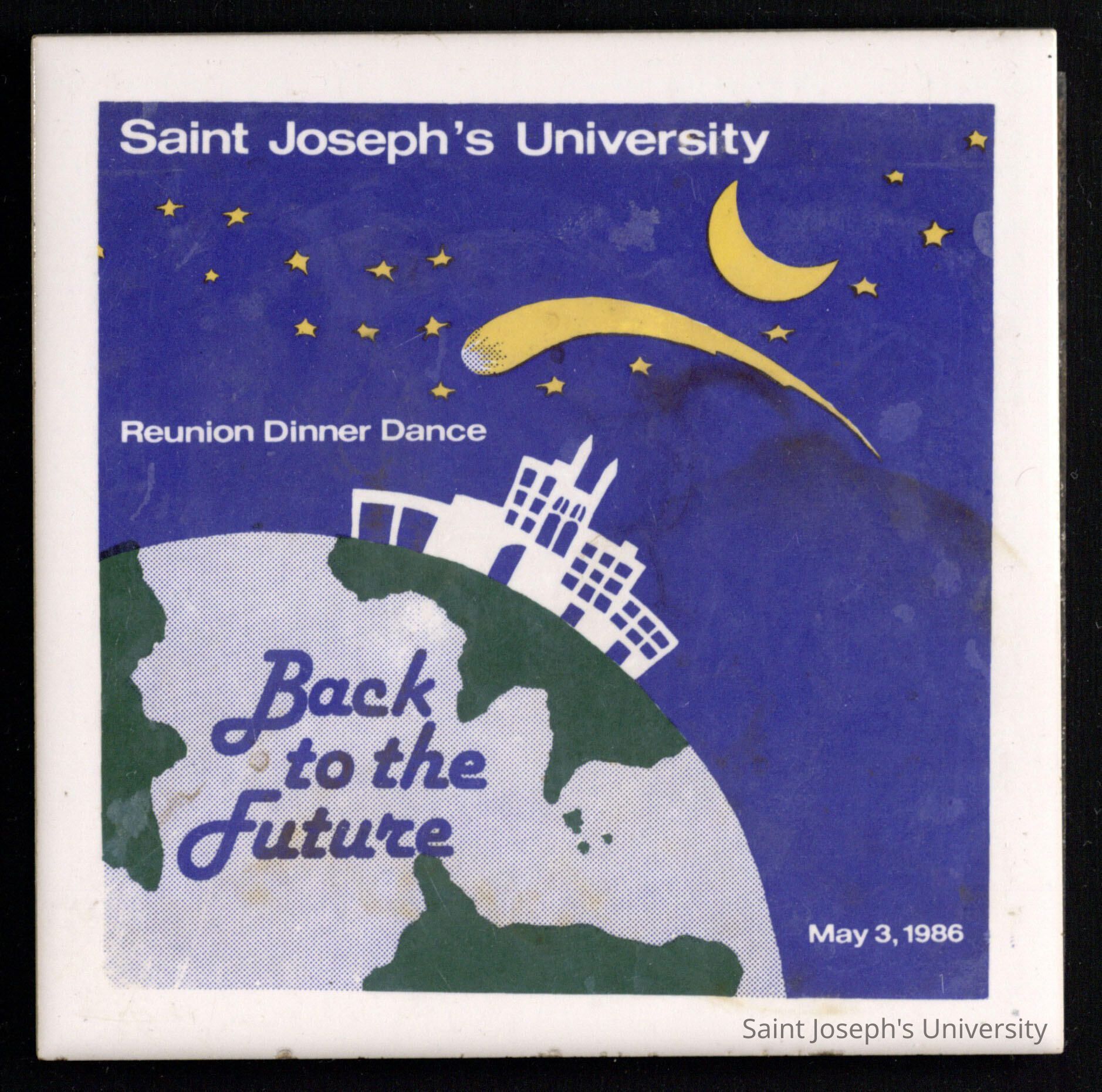 Two square ceramic tiles noting "Saint Joseph's University/ Reunion Dinner Dance/ Back to the Future/ May 3, 1986."