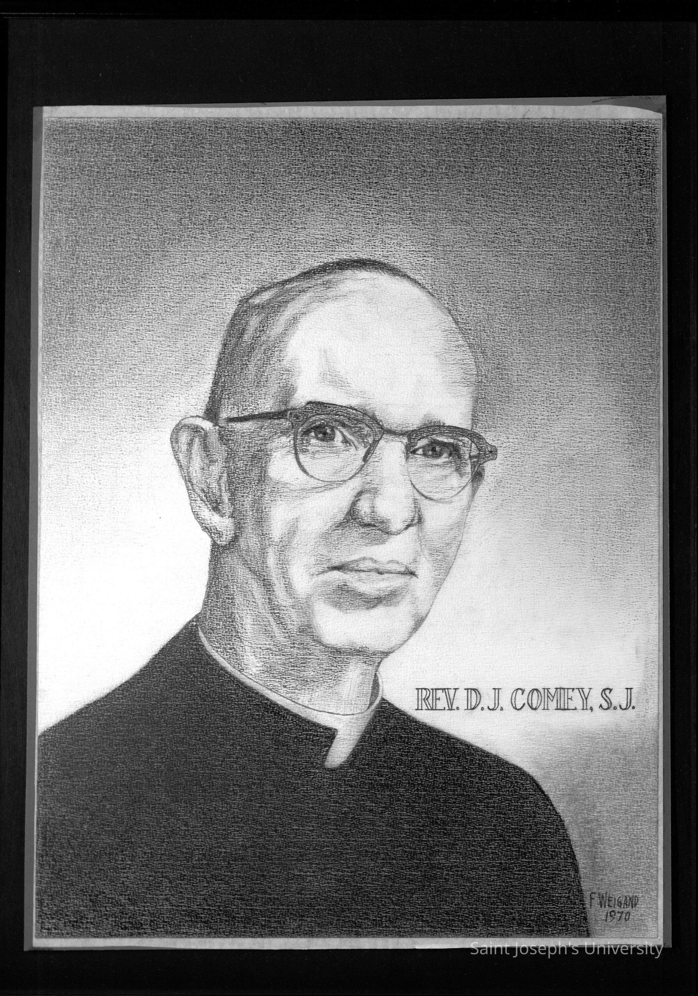 Charcoal portrait drawing of Rev. Dennis J. Comey, S.J. signed Weigand, 1970.