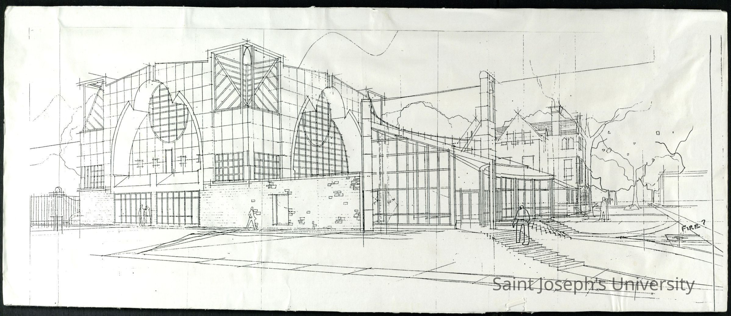 Copy of a pen sketch of the exterior perspective of the Chapel of St. Joseph looking northeast, circa 1991.